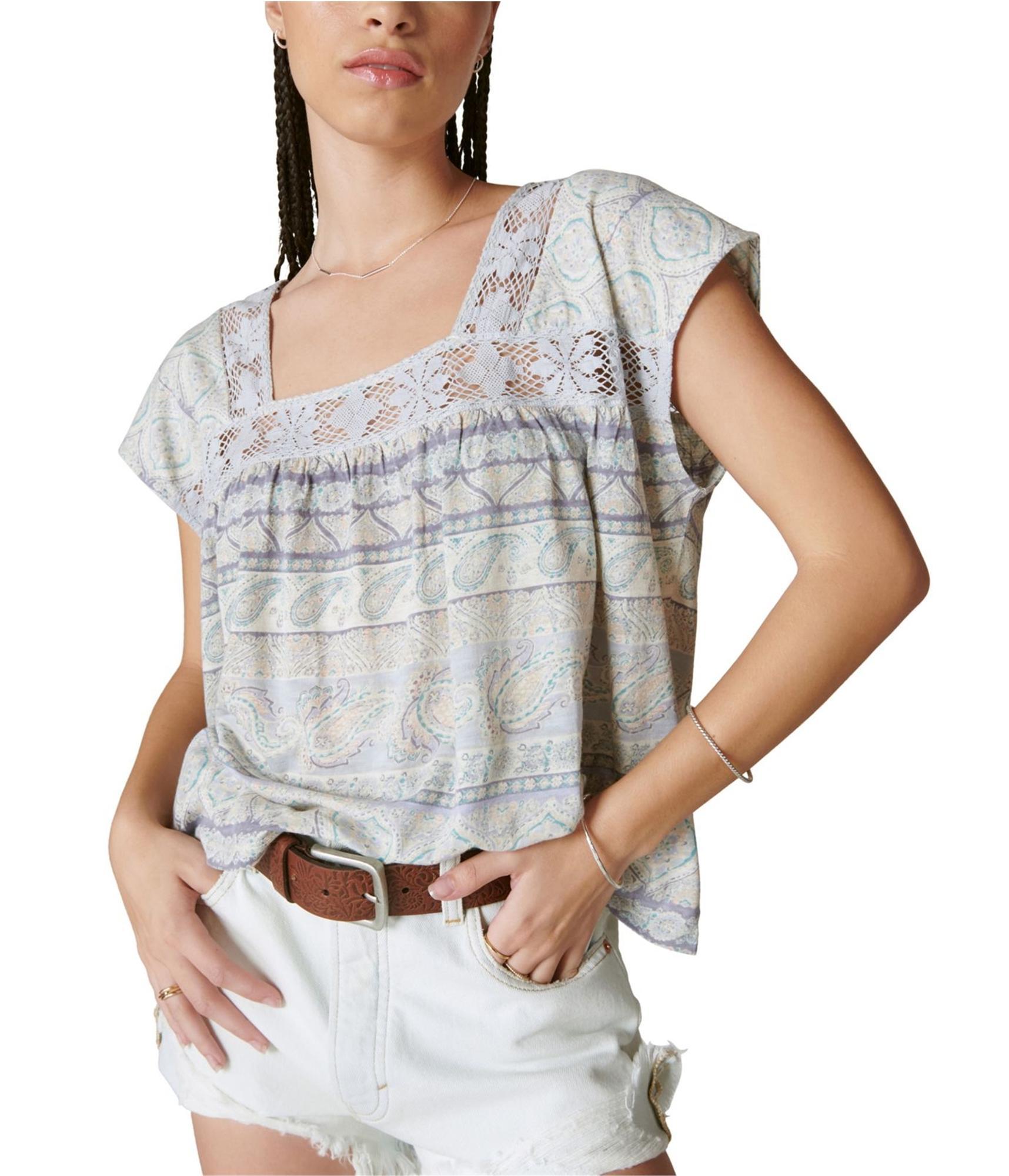 Lucky Brand Womens Lace Beach Embellished T-Shirt, blue, M