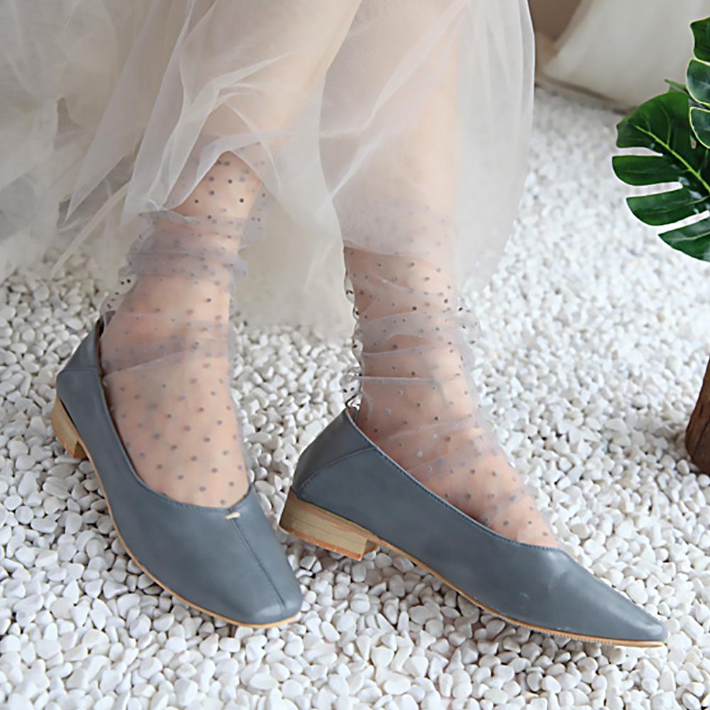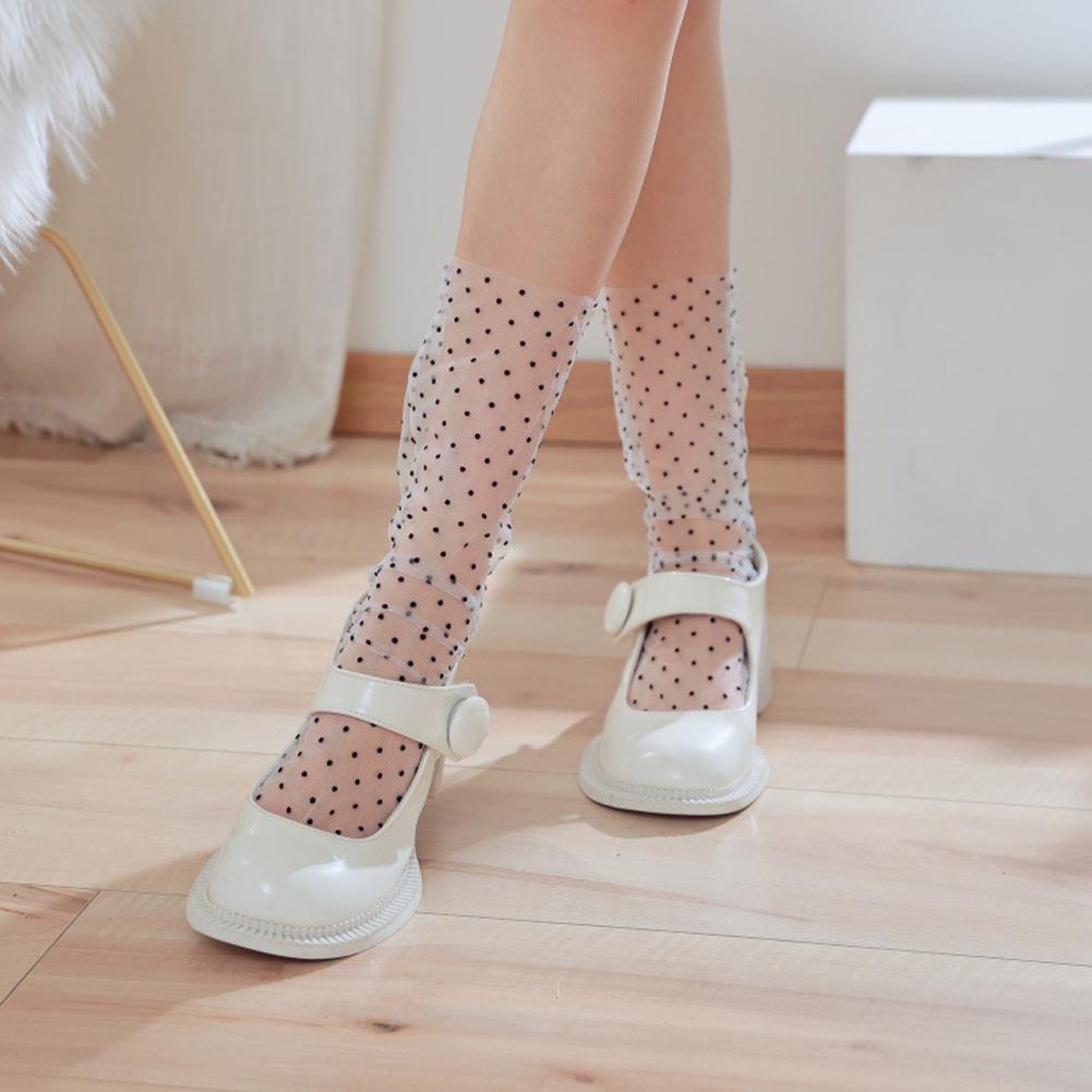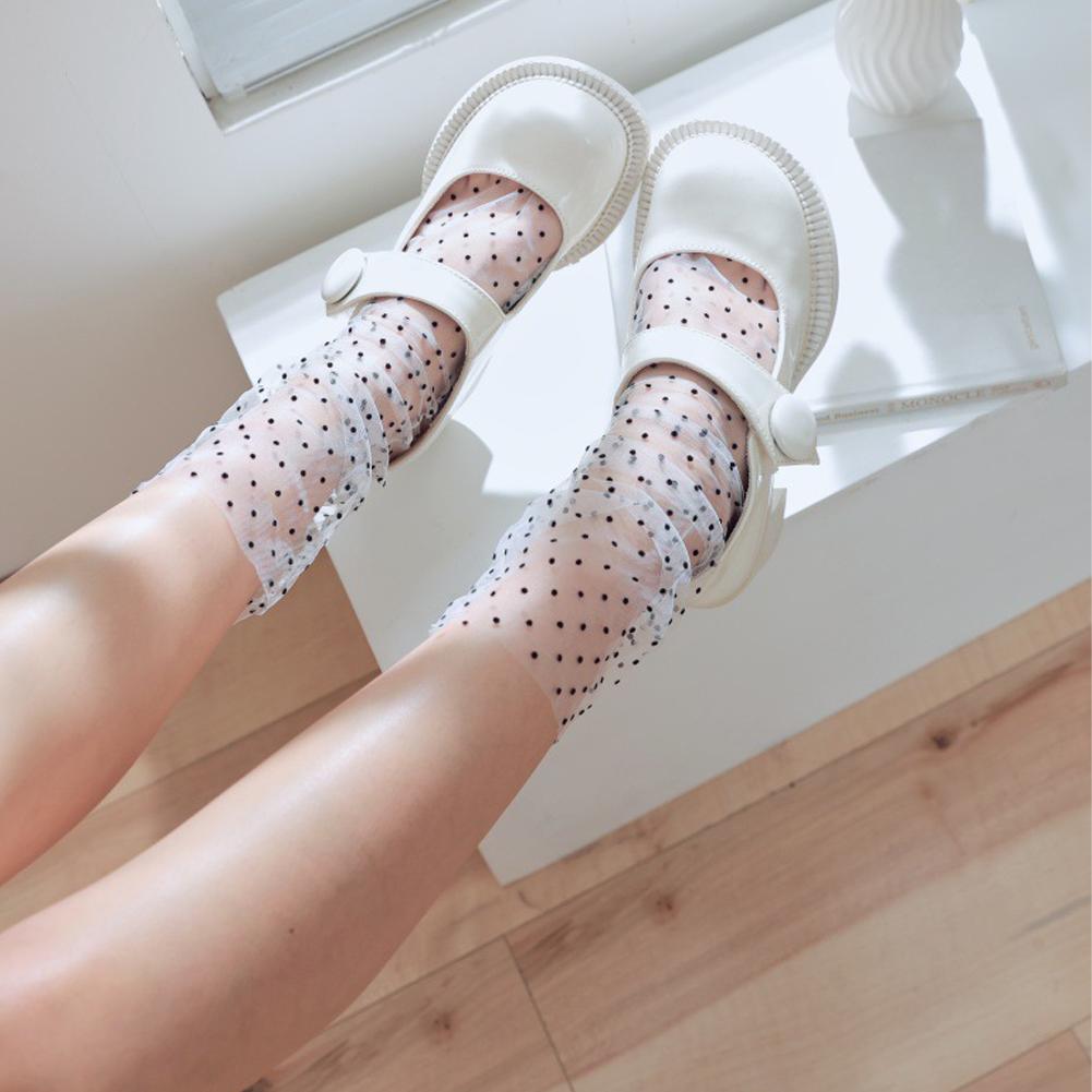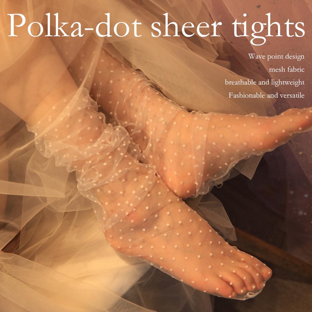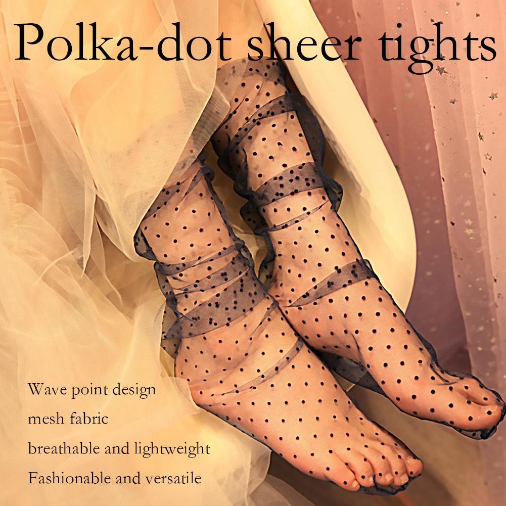 2. Polka Dot Style: Elevate your fashion with these charming sheer socks, adorned with a timeless polka dot pattern. Available in a broad spectrum of captivating shades including classic Black, crisp White, distinct White with black dots, sophisticated Gray, natural Beige, serene Blue, charming Pink, earthy Khaki, and rich Purple, allowing for endless styling possibilities to match any ensemble.