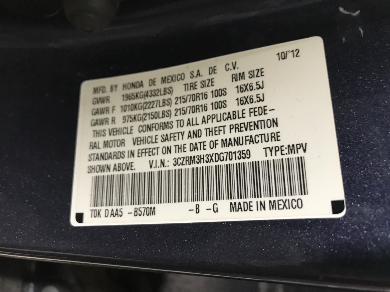 CR-V 12-14 (engine compartment), LX, FWD