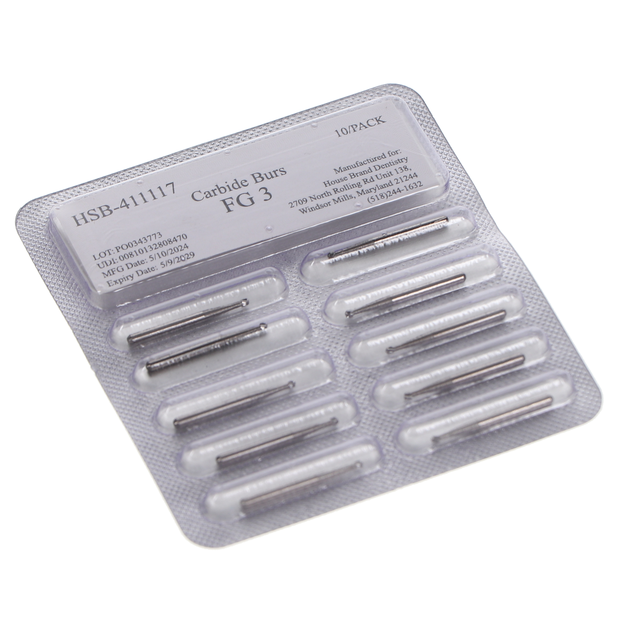 House Brand Dentistry FG #3 round carbide burs, pack of 10 burs.