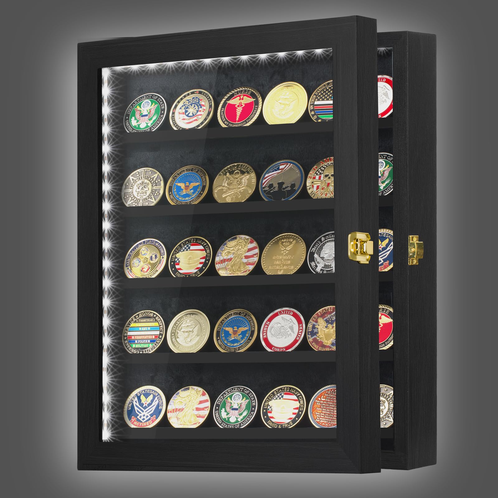 [EASY TO INSTALL] - The LED military challenge coin display case is securely packaged and fully assembled. It can be wall mounted by using the sawtooth hangers on the back or you can place it on any horizontal support for display. So don't hesitate, just get it!