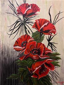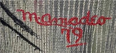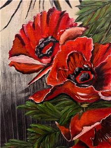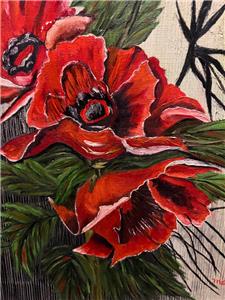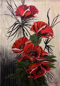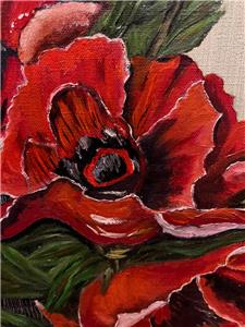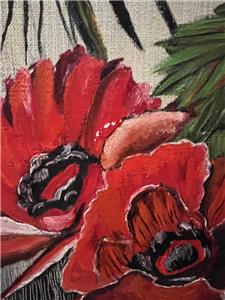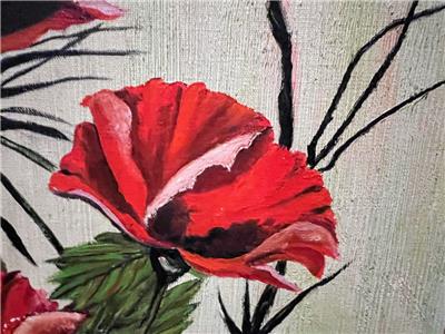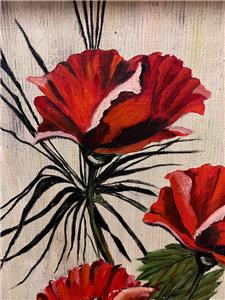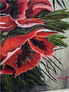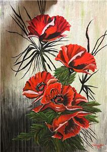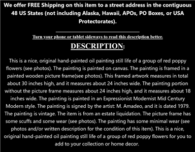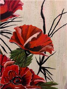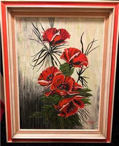 This is a nice, original hand-painted oil painting still life of a group of red poppy flowers (see photos). The painting is painted on canvas. The painting is framed in a painted wooden picture frame(see photos). This framed artwork measures in total about 30 inches high, and it measures about 24 inches wide. The painting portion without the picture frame measures about 24 inches high, and it measures about 18 inches wide. The painting is painted in an Expressionist Modernist Mid Century Modern style. The painting is signed by the artist: M. Amadeo, and it is dated 1979. The painting is vintage. The item is from an estate liquidation. The picture frame has some scuffs and some wear (see photos). The painting has some minimal wear (see photos and/or written description for the condition of this item). This is a nice, original hand-painted oil painting still life of a group of red poppy flowers for you to add to your collection or home decor.