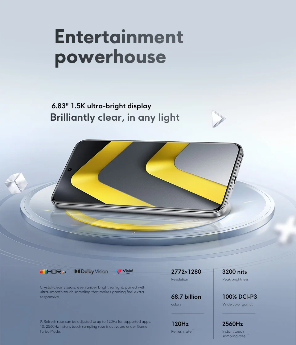 Screen ---------- 6.83" CrystalRes 1.5K AMOLED display, Resolution:2772×1280, 120Hz refresh rate