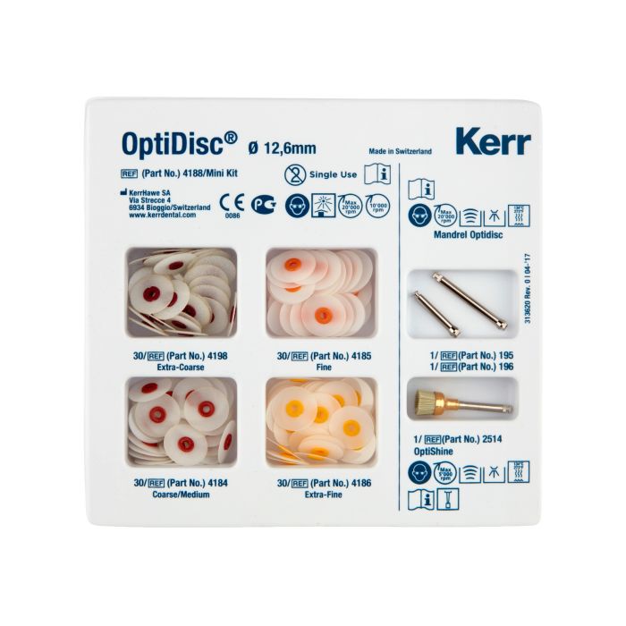 OptiDisc Mini Kit 12.6 mm. Made of durable polyester impregnated with aluminium oxide particles, the four grit system achieves a long lasting result. A colour-coded system enable immeadiate identification of the grit type.