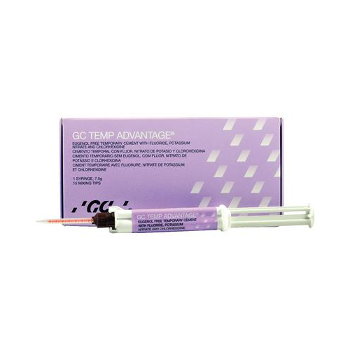 Eugenol Free zinc oxide temporary cement. Provides excellent seal and maintains low sensitivity. Working time of two and a half minutes and a two minute self-cure. GC Temp Advantage - Standard Package - Temporary Cement with Fluoride, Chlorhexidine and Potassium Nitrate, Standard Package contains: 1 - 7.5 Gm. Automix Syringe and 15 Mixing Tips.