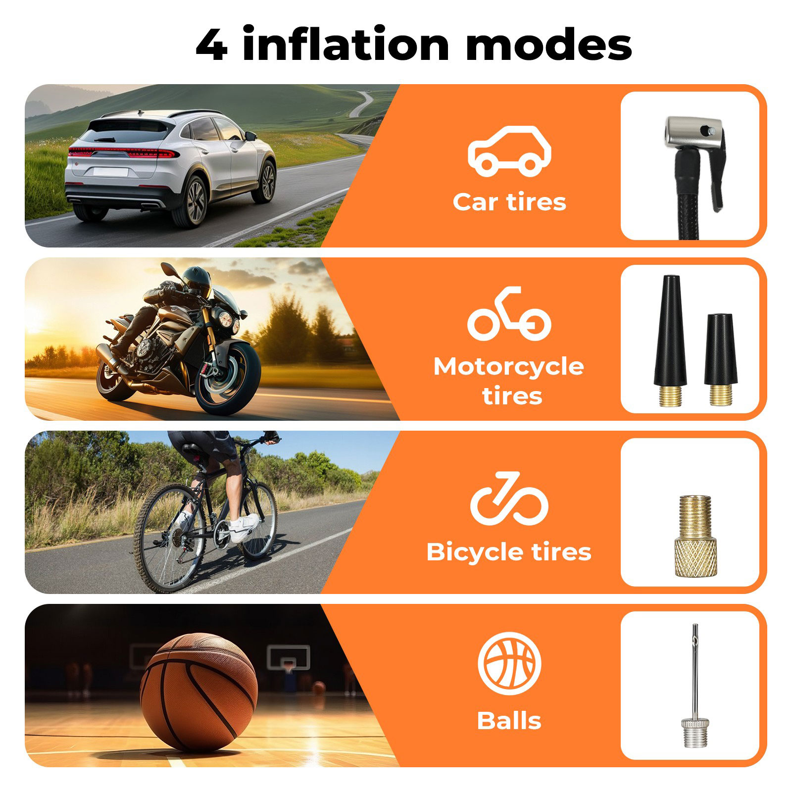 【Multiple Inflation Modes】This portable compressor features 4+N intelligent modes, perfect for cars, bicycles, motorcycles, and sports balls. Simply set the desired pressure – the pump automatically stops once reached.