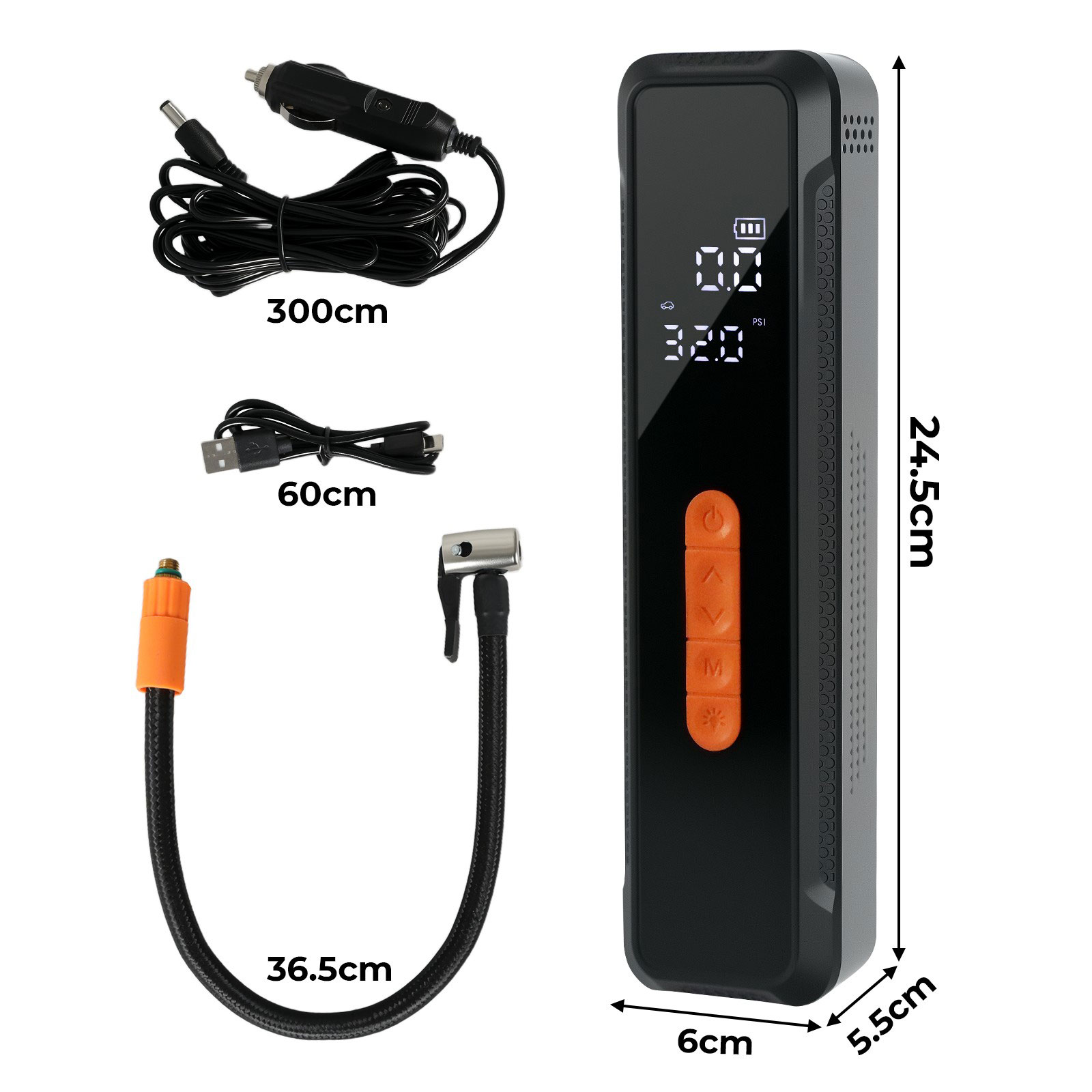 【Compact Multi-functional Device】This mini compressor is lightweight, slim, and easy to transport, making it suitable as a practical bicycle pump or car tire pump. With LED lighting and a USB-C port, it can also be used as a power bank – the perfect all-in-one solution for unexpected breakdowns!