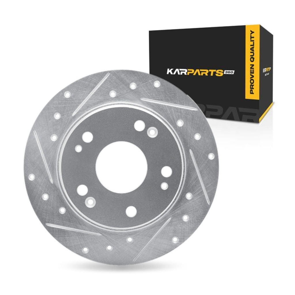 | Detail Product Information | Product Info: Part: Brake Rotor Color: Silver Drilled and Slotted Center Hole Diameter: 64 millimeters / 2.52 inches Discard Thickness: 8 millimeters / 0.31 inches Nominal Thickness: 9 millimeters / 0.35 inches Outside Diameter: 260 millimeters / 10.24 inches Stud/Lug Hole Quantity: 5