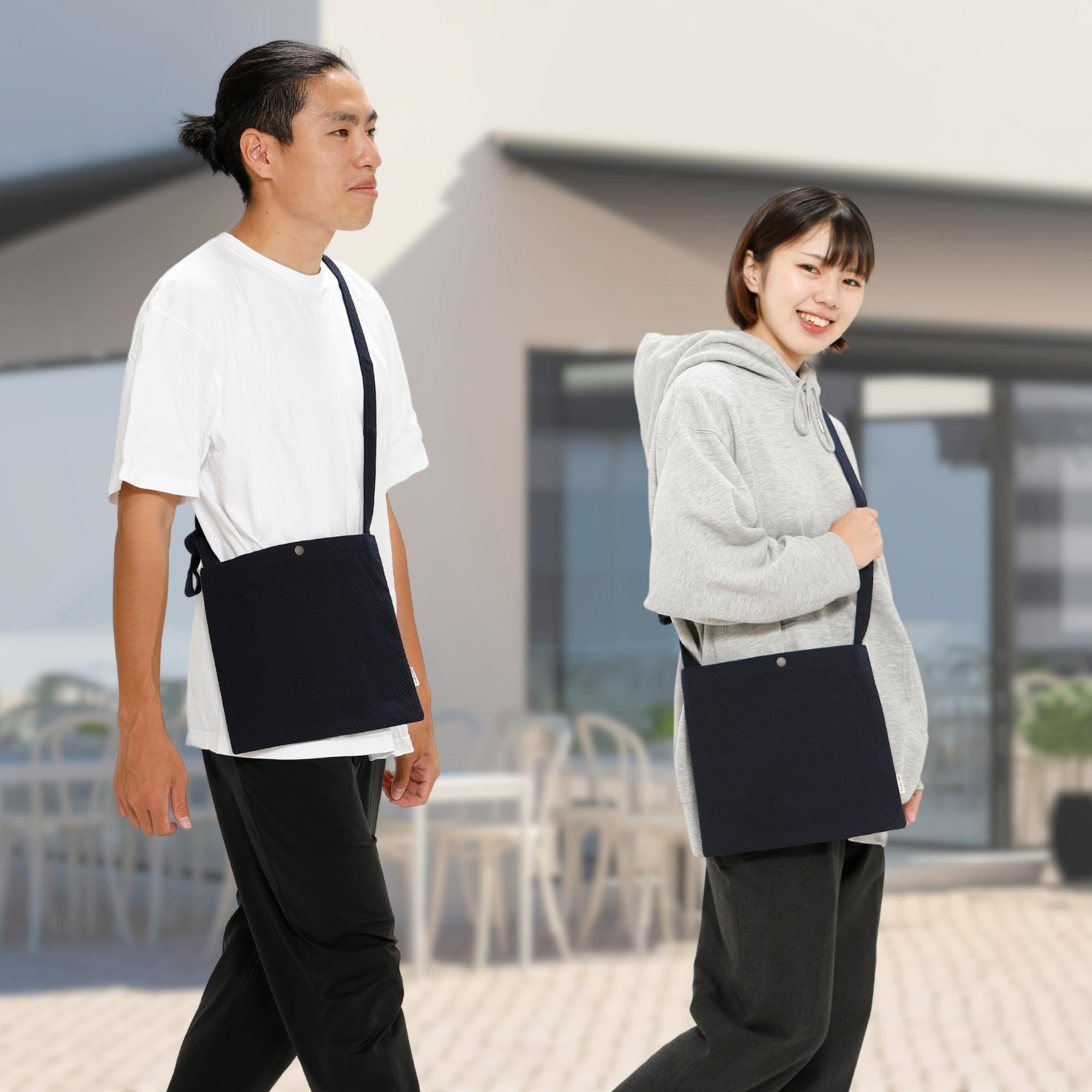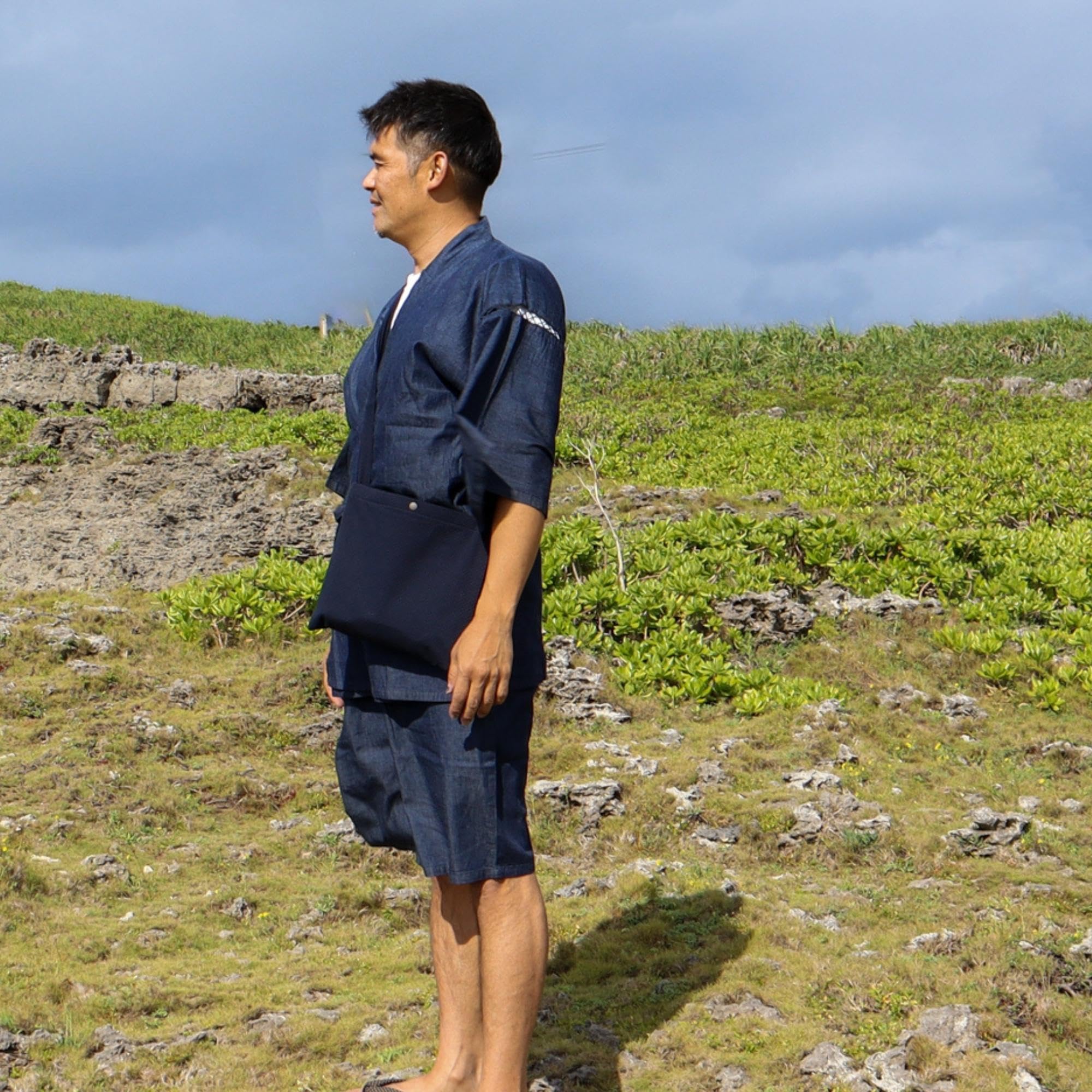 Approximately 26cm tall, 28cm wide, strap length approximately 125cm, no gusset, with inner pocket, 100% cotton (Sashiko fabric), Made in Japan. This sacoche is made with dyed sashiko fabric and sewn and patterned at a domestic factory. The strap is long enough to be tied and adjusted. It has a snap closure. The texture of the sashiko fabric complements both Western and Japanese clothing. It's convenient for carrying small items when you go out. As this product uses dye, the color may fade with friction, water, or washing. We recommend washing it separately. The sashiko fabric is discharge-dyed with a Japanese pattern. Perfect for cycling, walks, or quick trips.