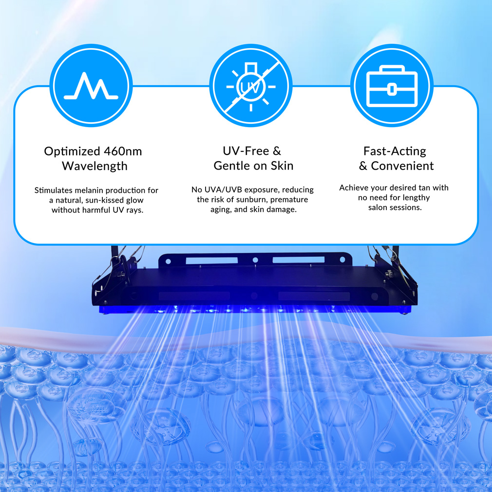 The device uses 460nm blue light technology, a wavelength commonly used in light-based cosmetic and wellness applications. The blue light emitted from the LED array provides even illumination to the skin surface while maintaining stable energy output. This wavelength can help stimulate certain photobiological responses in the skin and is often used in light therapy environments. The evenly distributed 96 LED beads help ensure uniform exposure across the treatment area, supporting consistent lighting coverage for localized tanning or light exposure sessions.