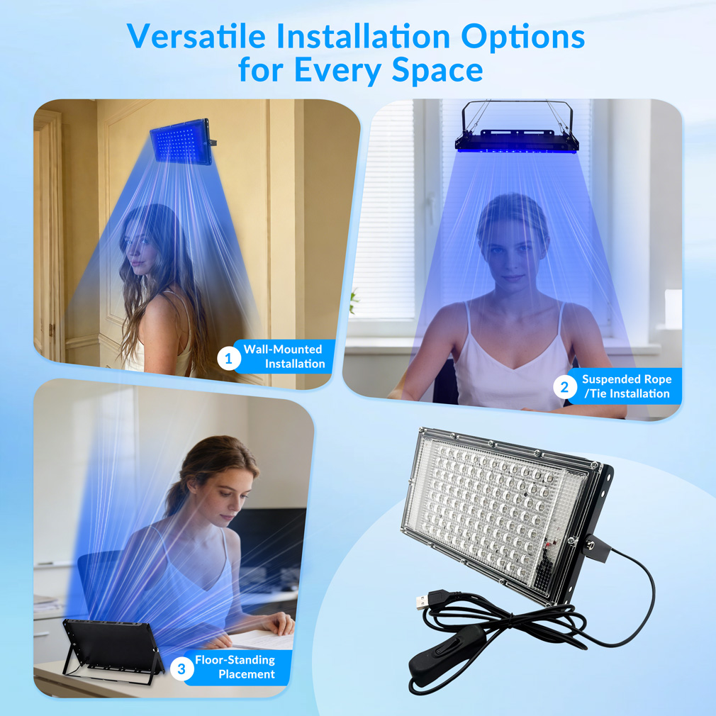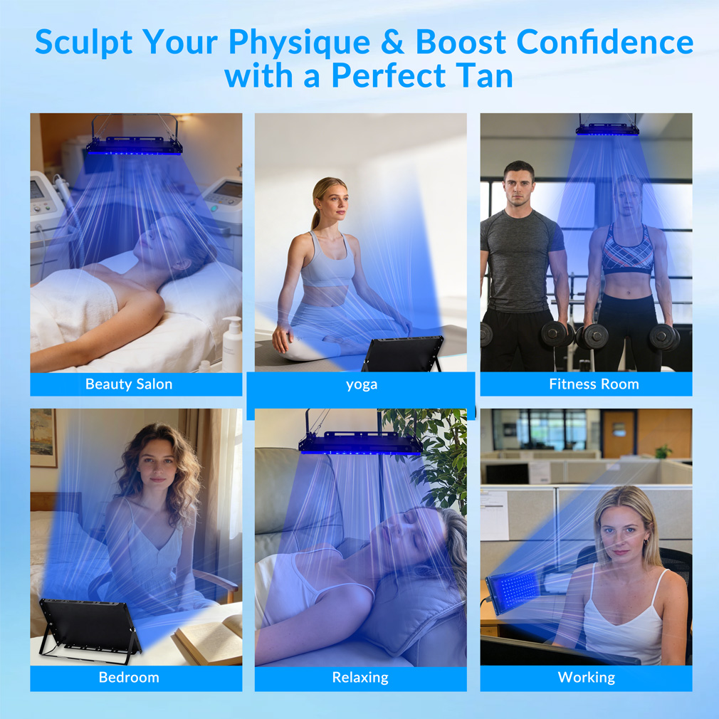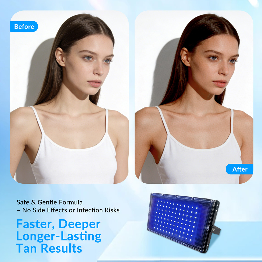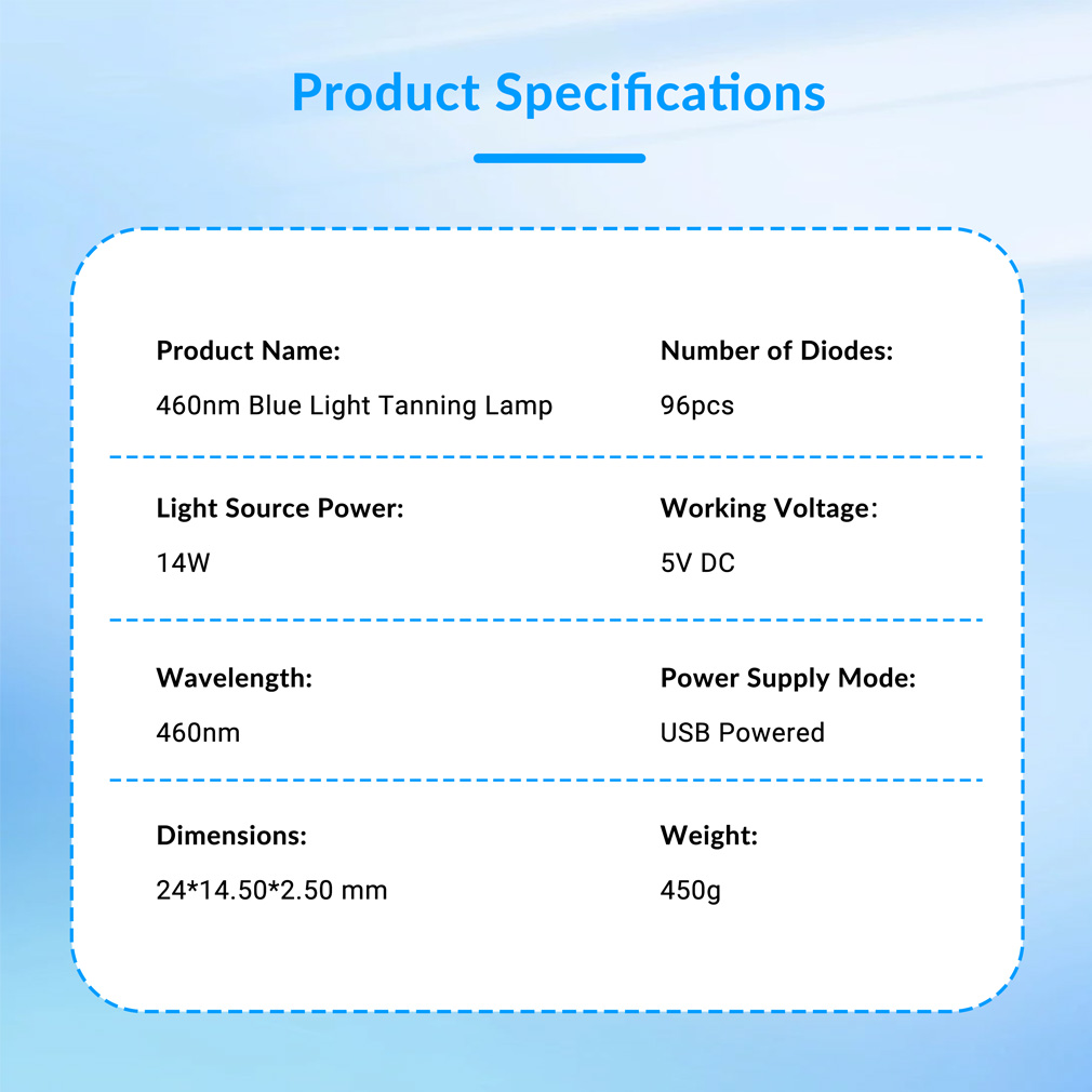The 14W portable blue light tanning lamp is a compact desktop LED device designed for convenient at-home localized tanning. It features 96 high-efficiency 460nm LEDs that deliver stable light output in a lightweight and portable structure. The lamp is equipped with a 180° flexible adjustable bracket, allowing users to easily change the angle for comfortable positioning during use. Its desktop design makes it suitable for hands, arms, legs, or other areas of the body. With USB connectivity and four charging points, the device is convenient to power using adapters, computers, or power banks, making it ideal for home or travel use.