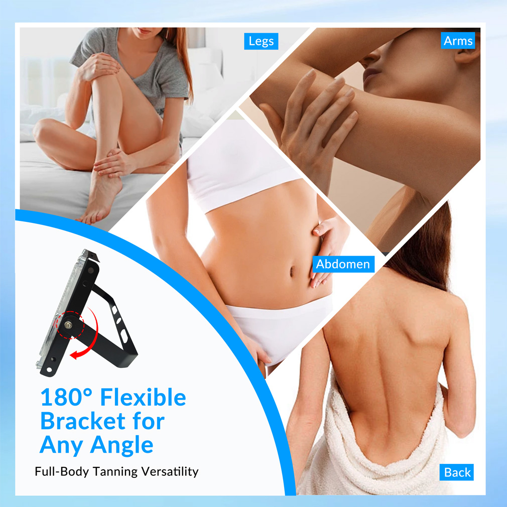 This portable tanning lamp is suitable for localized skin tanning and light exposure at home. It can be used on areas such as the face, arms, shoulders, legs, and back, depending on positioning and distance from the lamp. The adjustable bracket allows users to easily adapt the lamp angle for different body areas, making it versatile for both small and larger treatment zones. The device is intended for cosmetic light exposure routines and can be conveniently placed on a table, desk, or flat surface during use.