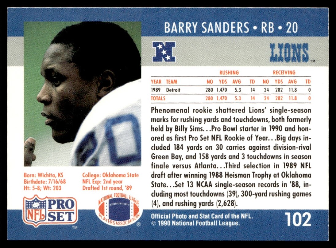 1990 Pro Set Barry Sanders Detroit Lions #102
