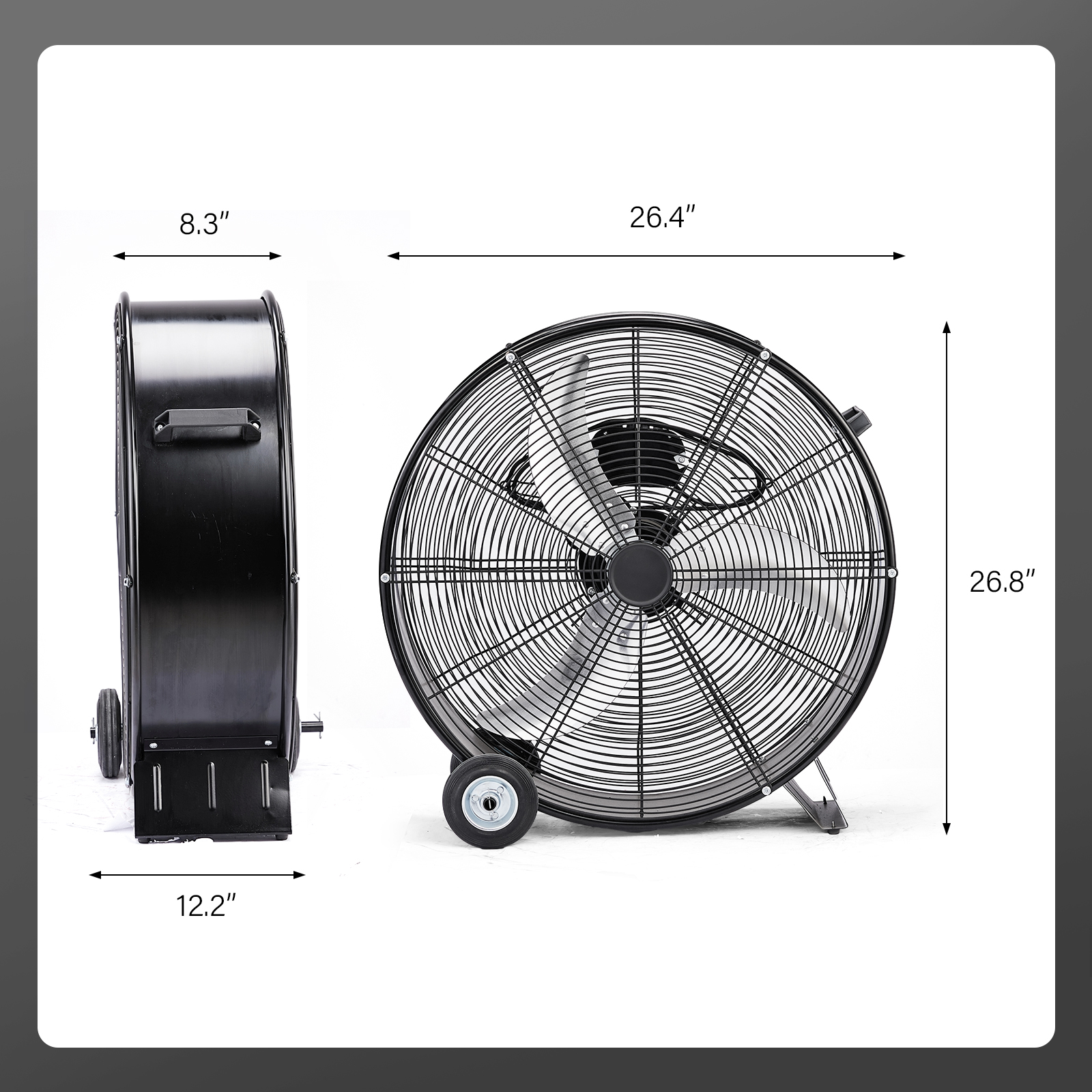 【Effortless Mobility with Wheels & Handle】Move air wherever you need it with ease! This 24-inch drum fan comes with a convenient handle and two large wheels, making it simple to roll from room to room. Just grip, push, and go—no heavy lifting