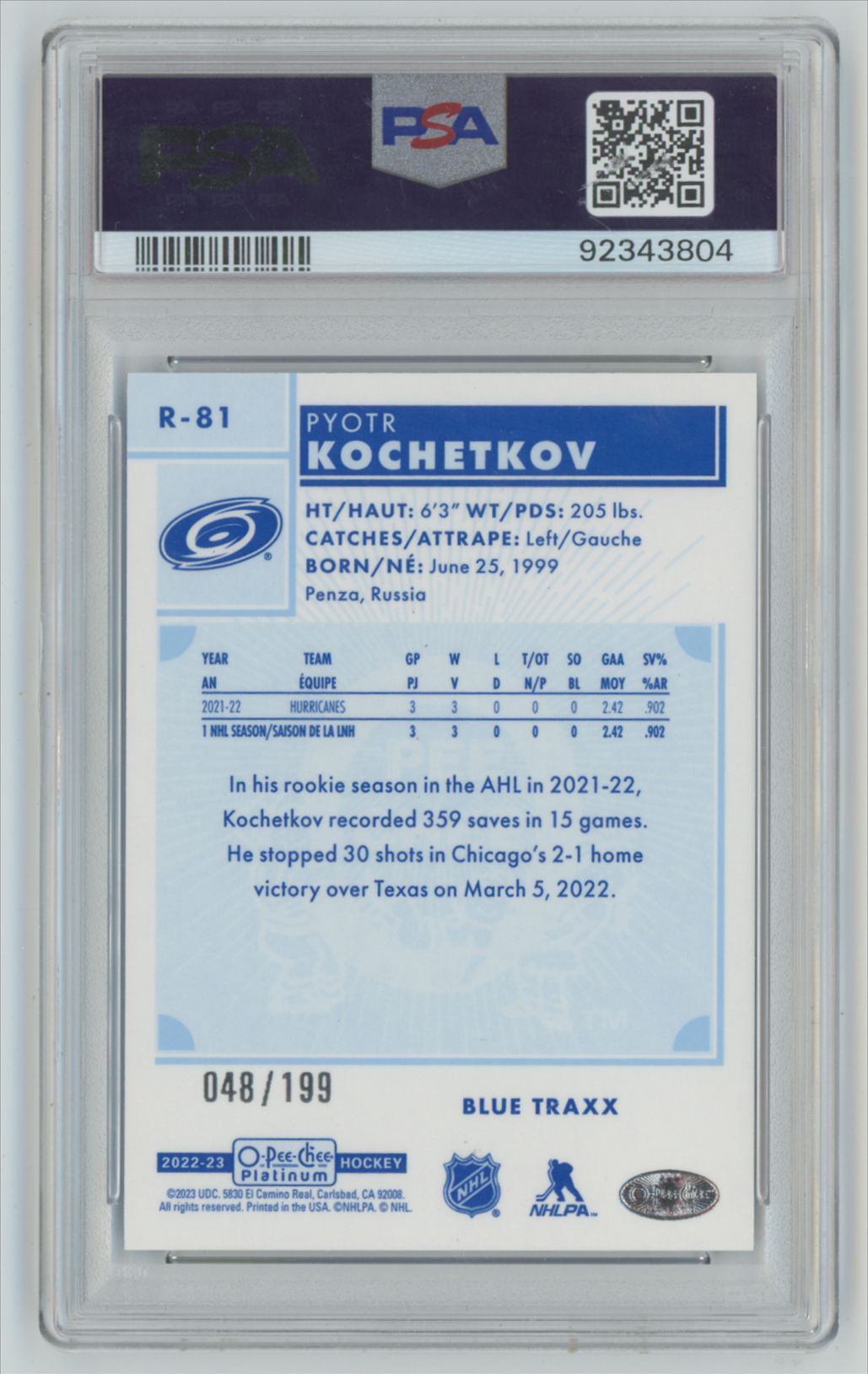 2022-23 OPC O-Pee-Chee Platinum Retro Blue Traxx Psa 10 POP 1 Pyotr Kochetkov