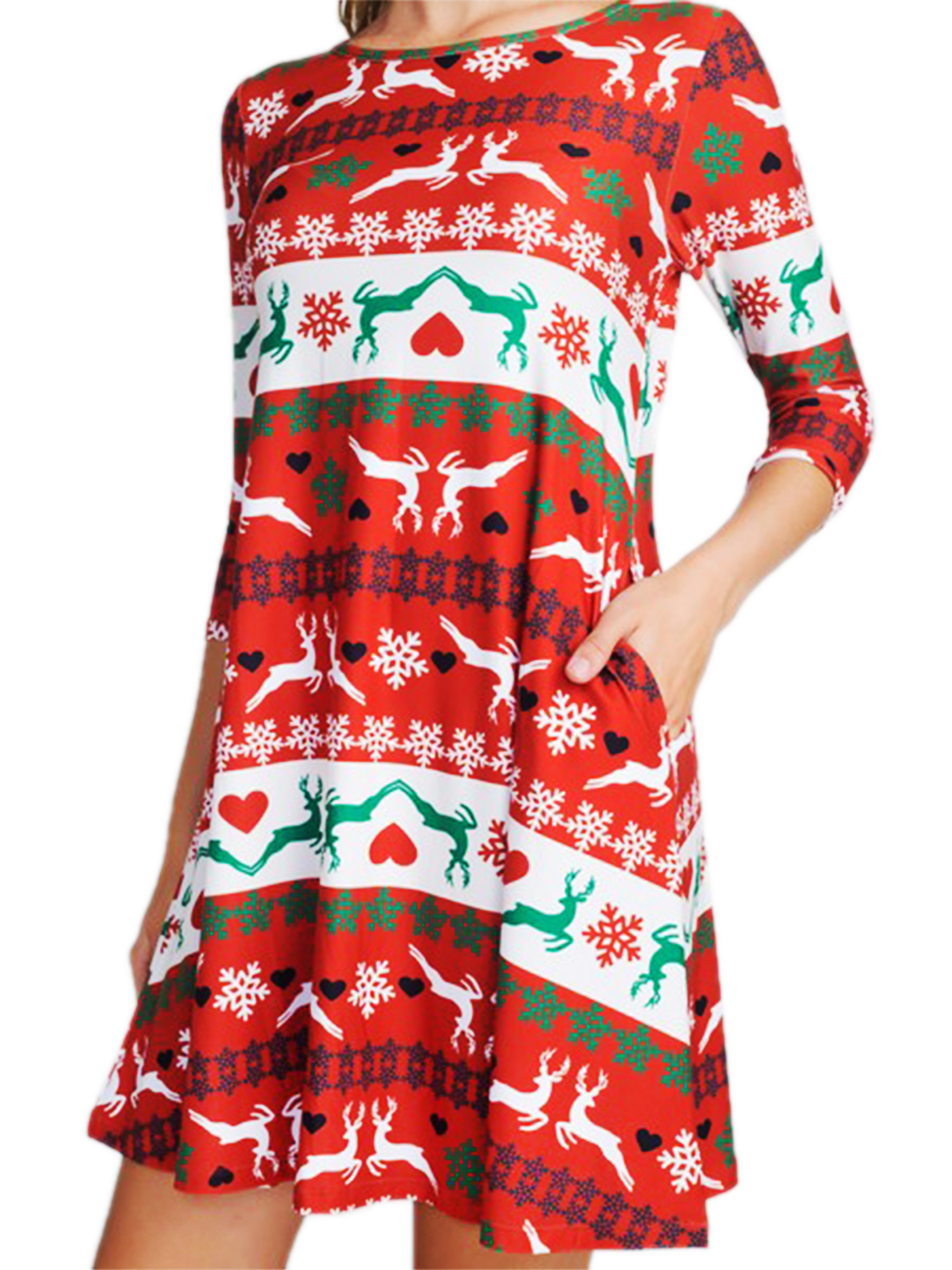 This festive holiday dress features three quarter length sleeves, hidden pockets on each side, and falls slightly above the knee.