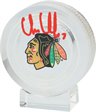 Chris Chelios Chicago Blackhawks Autographed Crystal Puck - Filled with Game-Used Ice from the 2023-24 Season