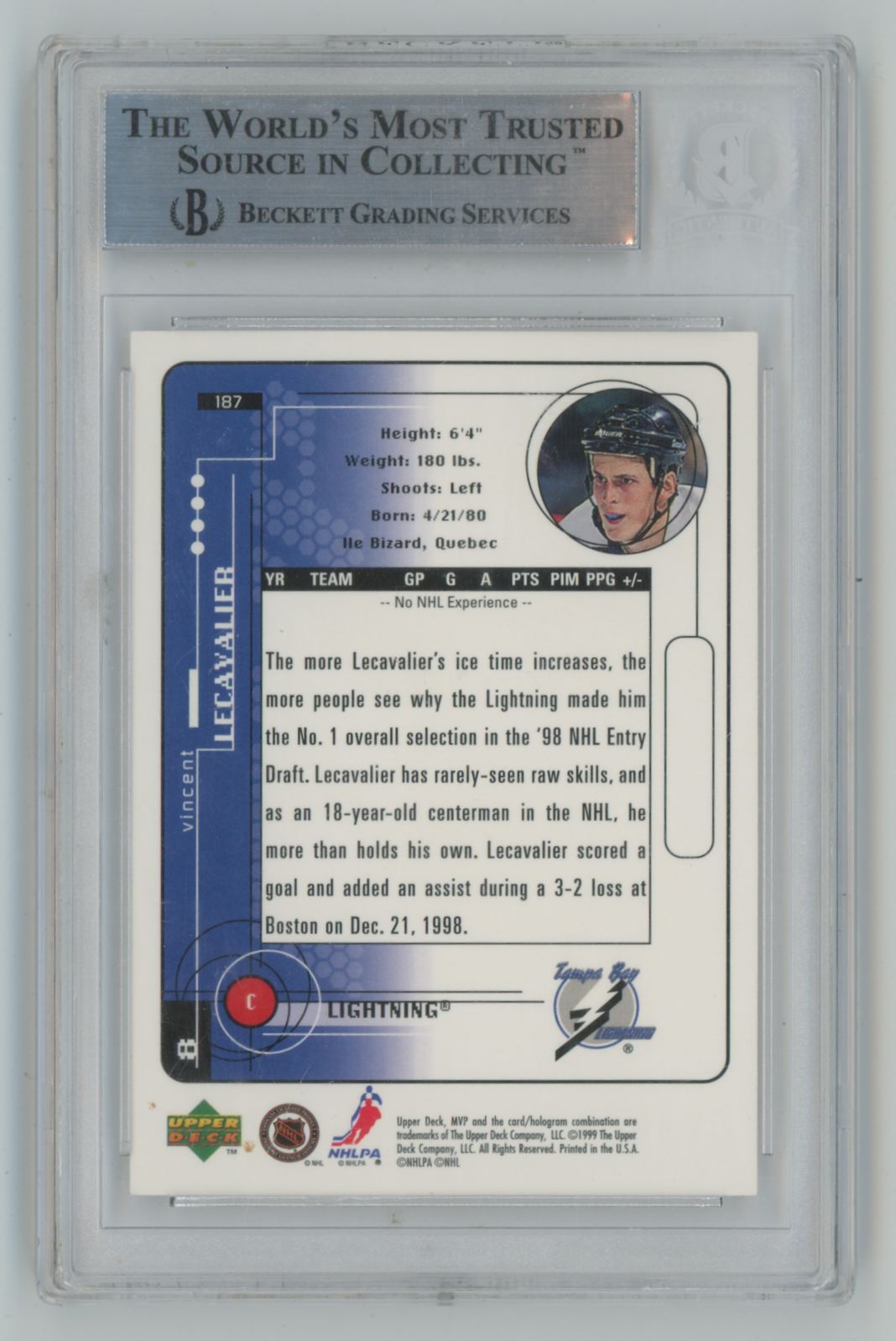 1998-99 Upper Deck MVP Auto BGS Authentic Vincent Lecavalier Auto #187 Tampa Bay