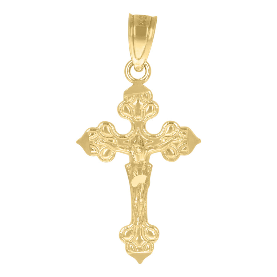 (0.6 gr. 10k Yellow Gold | Length: 25.5mm (including the bail) | Width: 12.5mm | 10k Yellow Gold Filigree Crucifix Pendant Statement Charm)