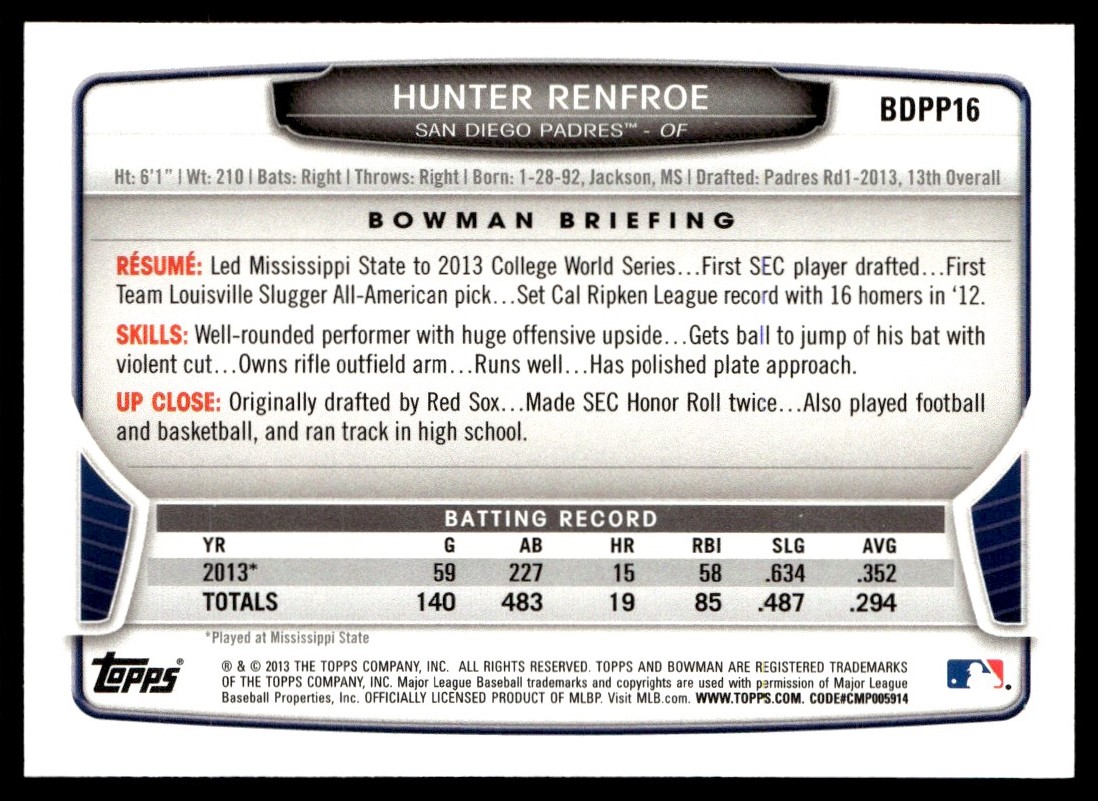 2013 Bowman Draft Picks & Prospects Hunter Renfroe San Diego Padres #BDPP16