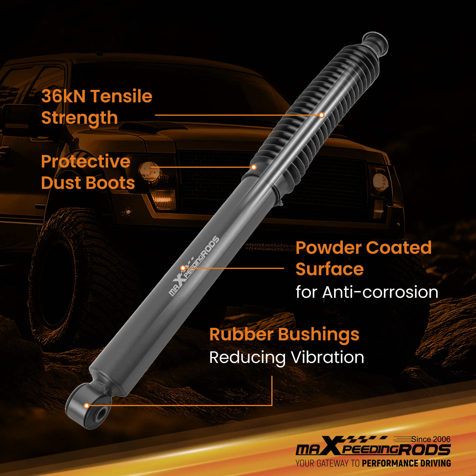 Featuring a robust 18mm chromed hardened piston rod and impressive 35KN tensile strength, built to handle the toughest terrains.