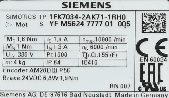 Siemens Simotics S 1FK7034-2AK71-1RH0 1FK7 034-2AK71-1RH0 3-Phase Servo Motor