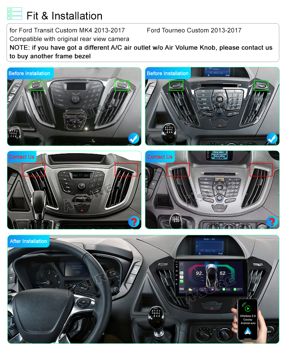 9 Inch Android 13 Car Stereo For Ford Transit Custom 2013-2017: Upgrade your driving experience with this sleek Android car radio featuring a 9" 1280*800 HD 2.5D capacitive touch screen. With 2GB RAM and 32GB ROM, you can easily download your favorite apps and videos to keep you entertained on the road. Installation is a breeze with no additional frame or cable changes required - simply plug and play for instant enjoyment. Drive in style and stay connected with this advanced car radio.
