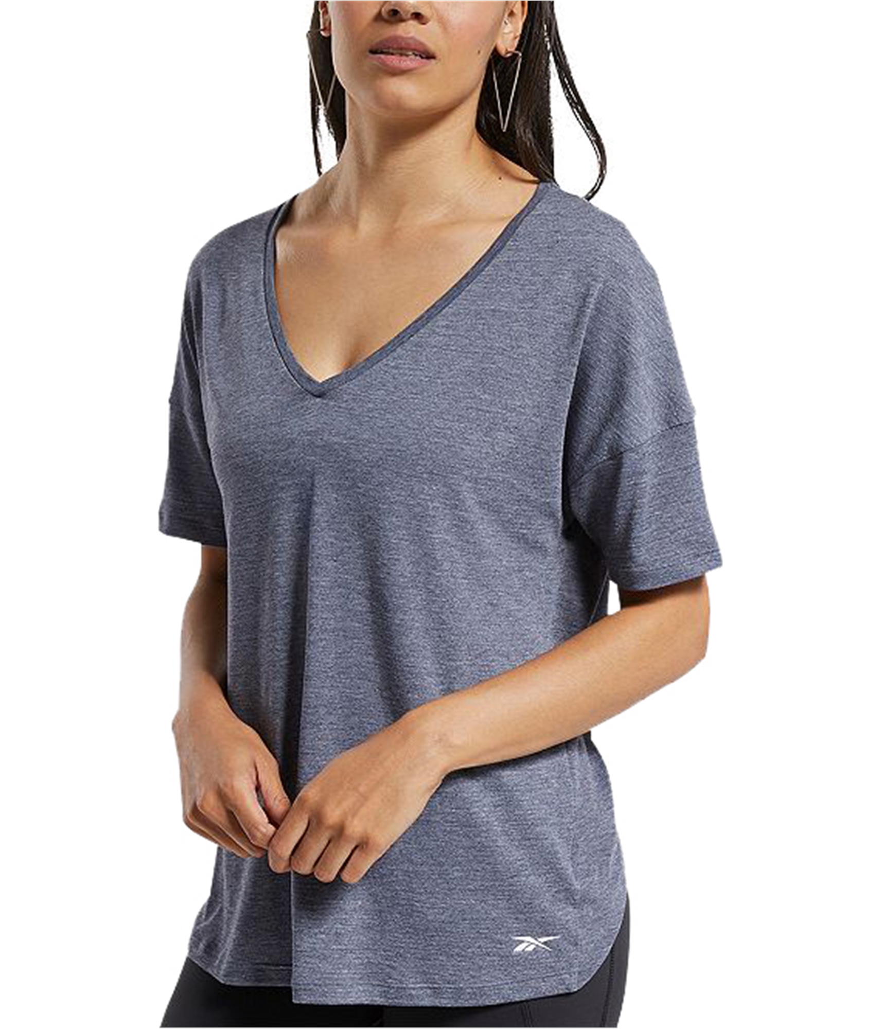 Product Details Gender: Womens Fit: Classic Fit Material: 44% Nylon, 36% Polyester, 20% Cotton Sleeve Length: Short Sleeve Collar Style: V-Neck Pattern: Heathered Features: Moisture Wicking Density: Light Weight Season: All Seasons Occasion: Athletic Theme: Workout Performance: Comfort Country of Manufacture: Vietnam