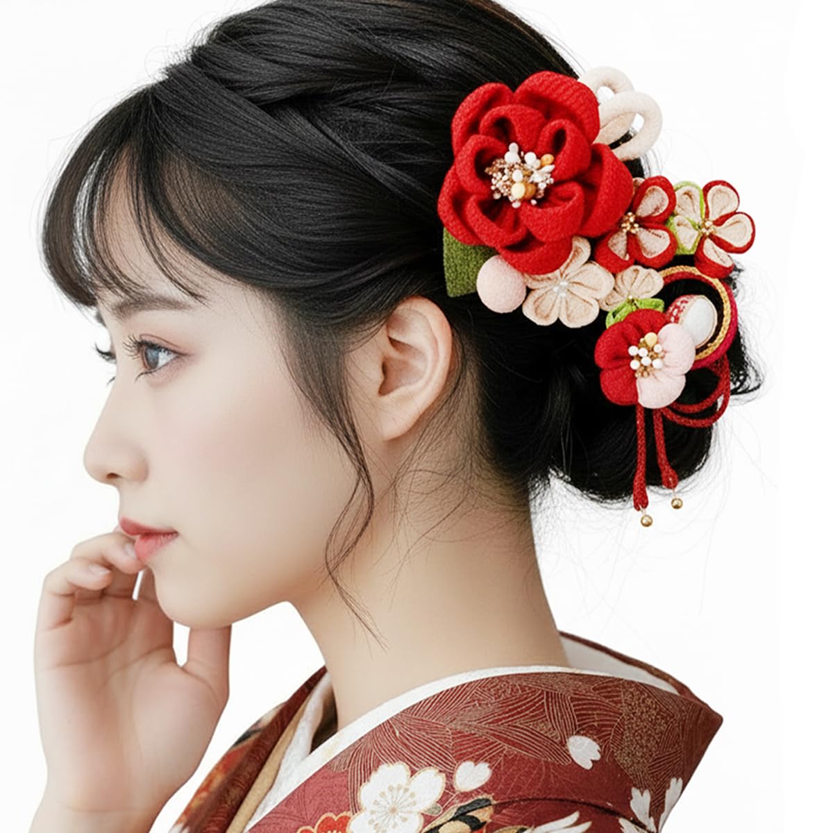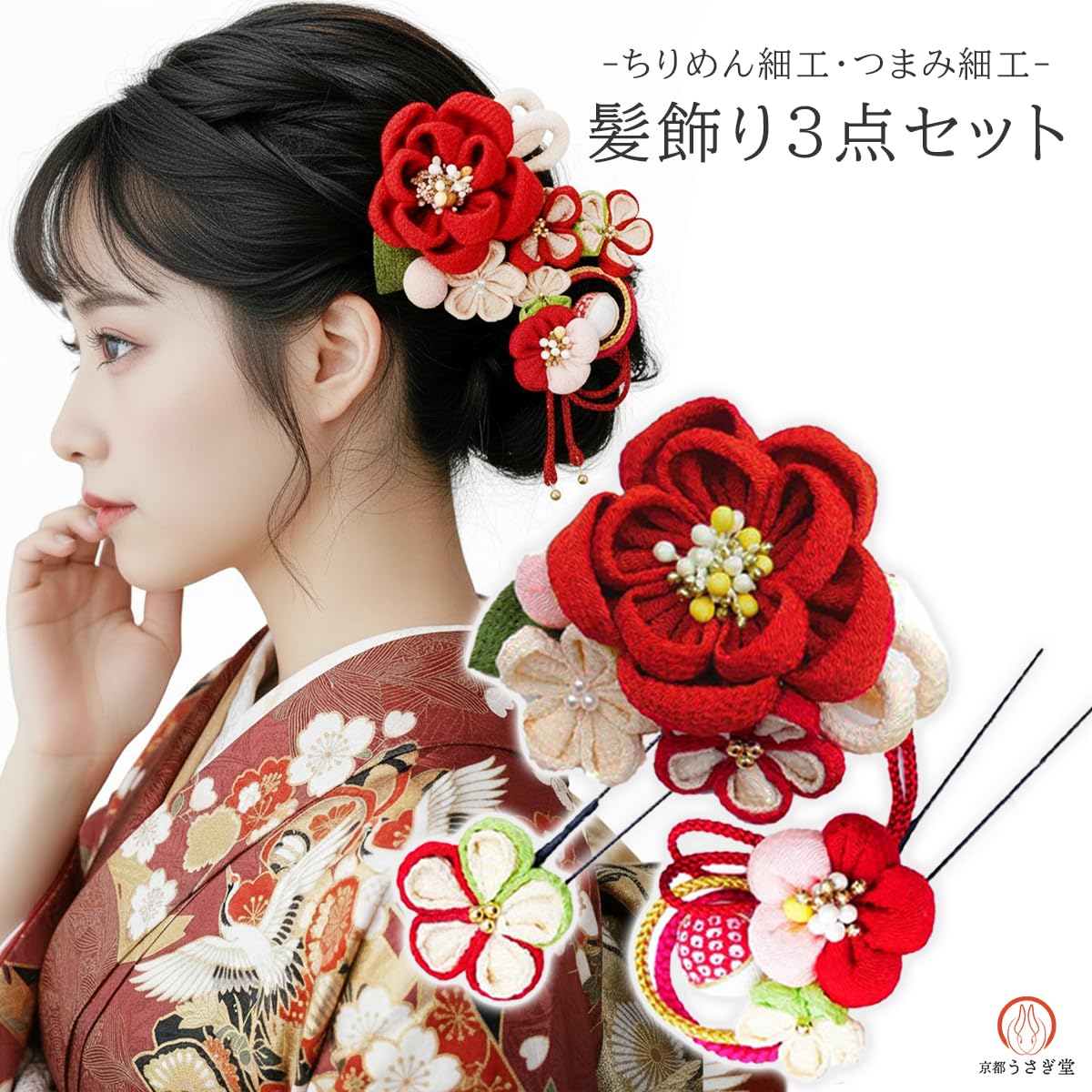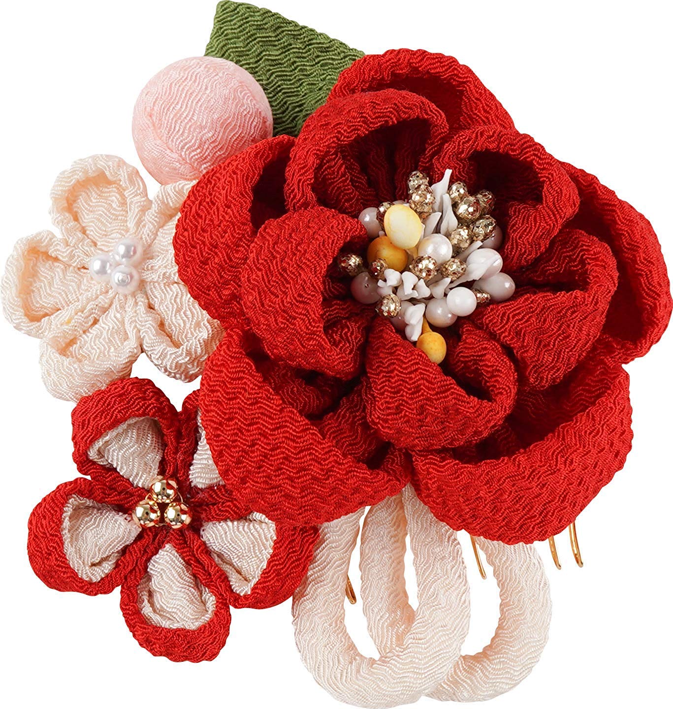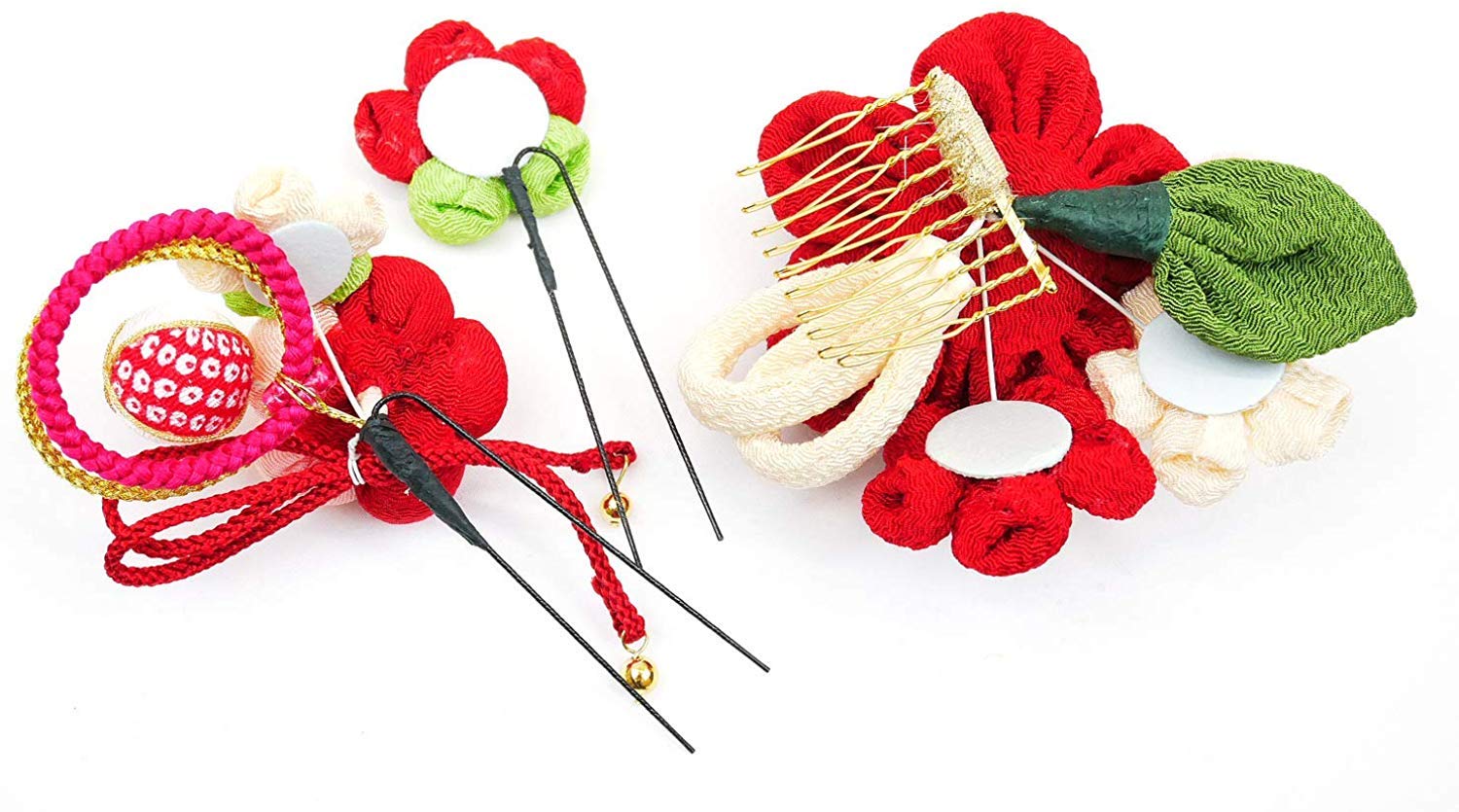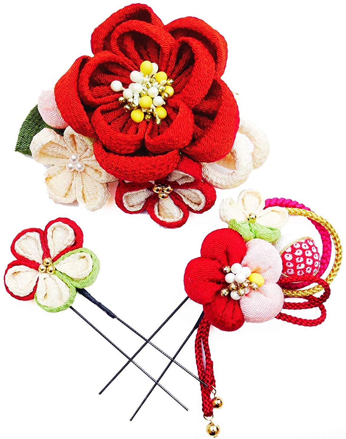 Japanese Kanzashi Hair Clip 3-Piece Set Tsumami Zaiku Furisode Red