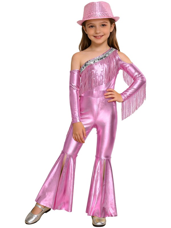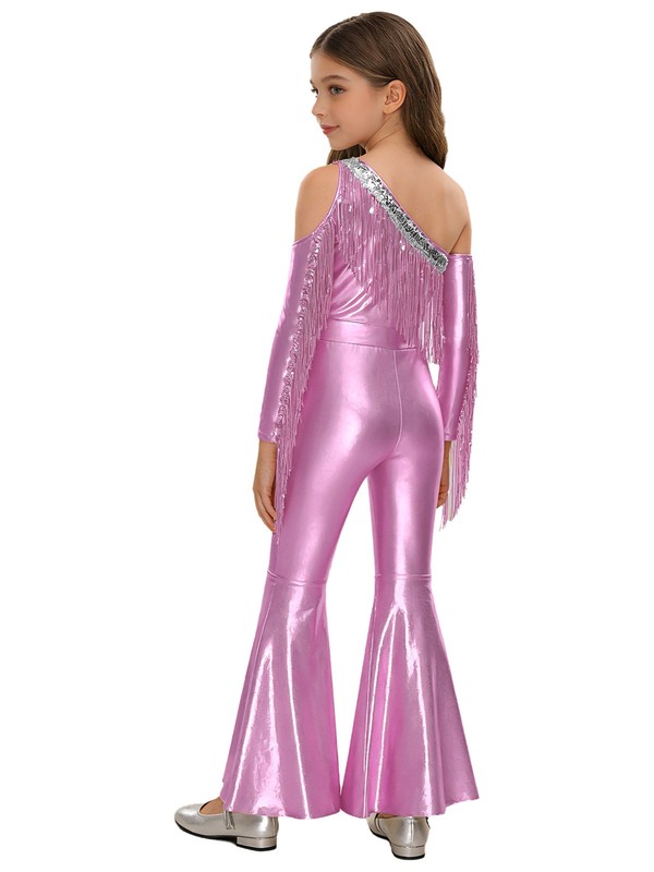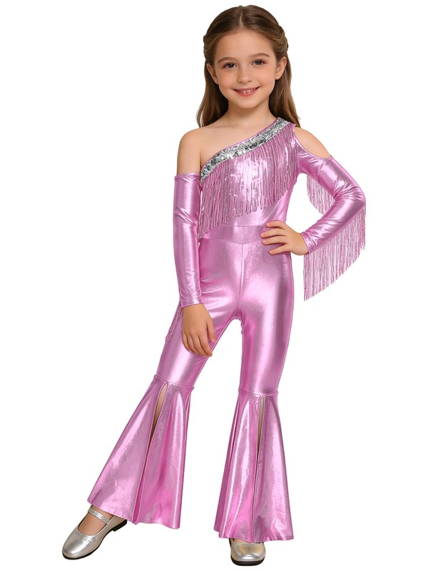 The tassel and slit details on the bell-bottom jumpsuit add a dynamic and playful vibe, making it a great choice for energetic little girls.