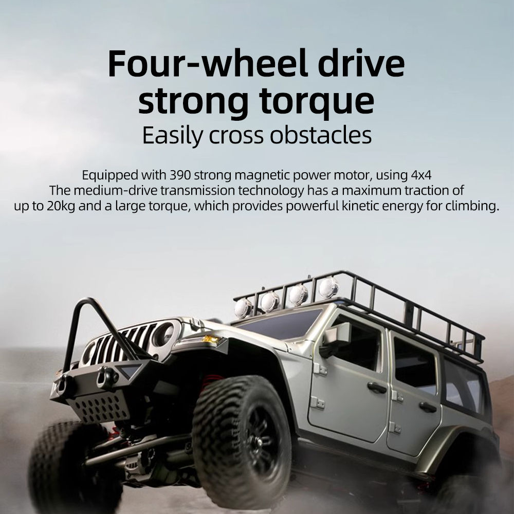 Features: 1. 2.4G Full proportional control,Independent Shock Absorber. 2. Fullly featured: go forward, go back, turn left and right. 3. Equipped with a 390 strong magnetic motor and 4x4 medium drive,the max traction can reach 20kg. 4. 48mm high chassis design, suitable for various uneven and difficult road surfaces, climbing is no less impressive. 5. The car can move to a long distance MAX distance about 50M,and satisfied your wish. 6. All-terrain rubber tires with strong groundadhesion and friction resistance. 7. Adapt to driving in multiple environments such as sandy, muddy, and rocky mountain roads.