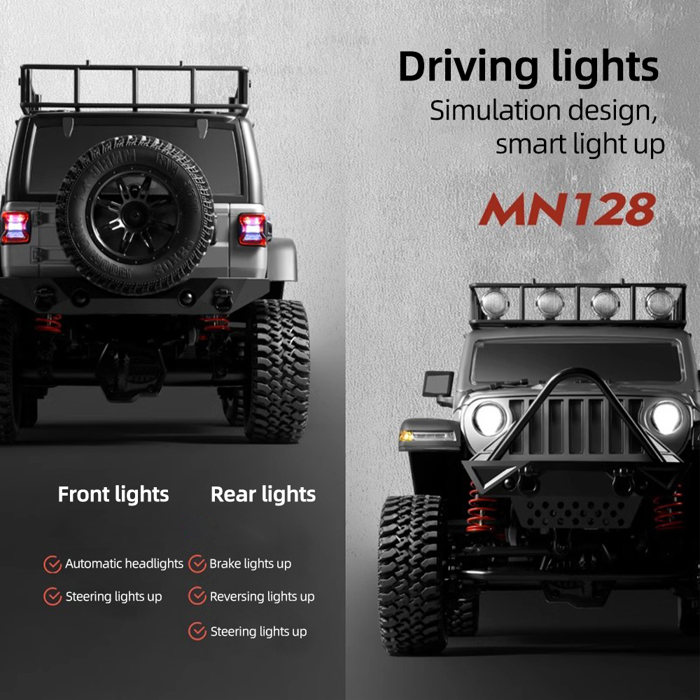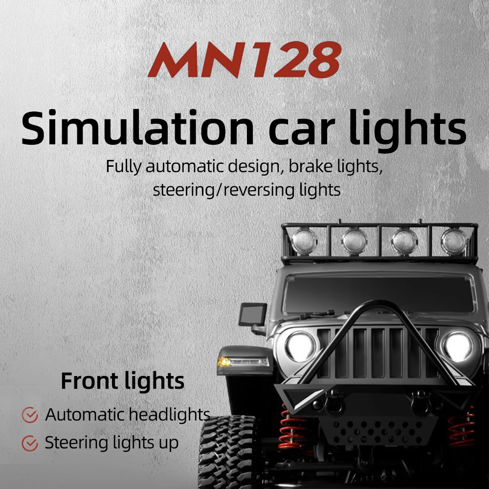 Description: MN128 1/12 Model Climbing Off-road Vehicle Adapt to driving in multiple environments such as sandy, muddy, and rocky mountain roads.bring you a new visual feast,a new sense of control.