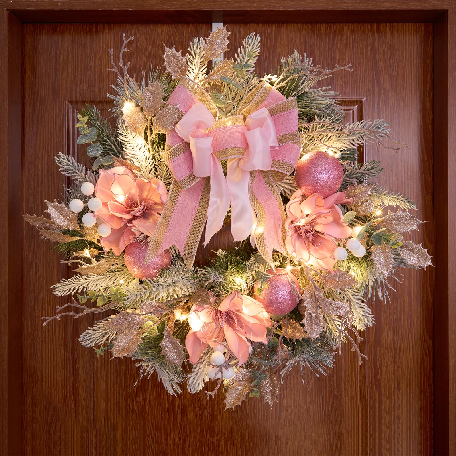 22inch Christmas Pink Wreath for Front Door with 30 LED Lights,Elegant Pink2