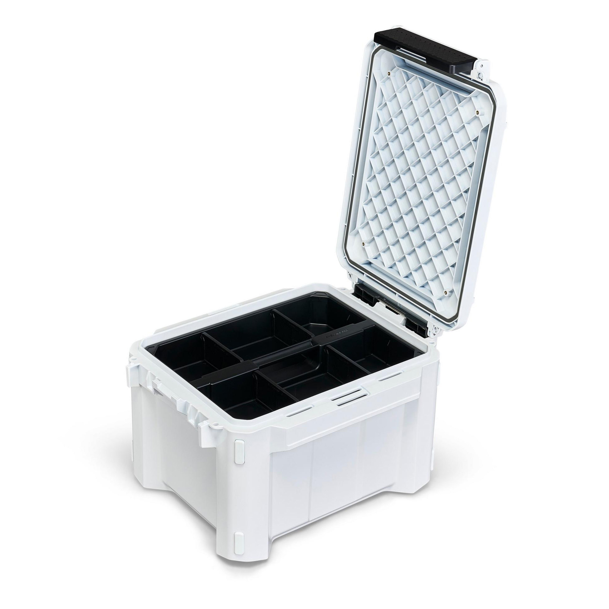 Inside, a smart organization system keeps everything in its place. The removable tray with customizable dividers sorts smaller items and parts, while the main compartment with divider handles larger gear and containers. Outside, rubberized non-skid feet keep the box stable, while tie-down slots and a lockable lid ensure secure transport wherever you go.