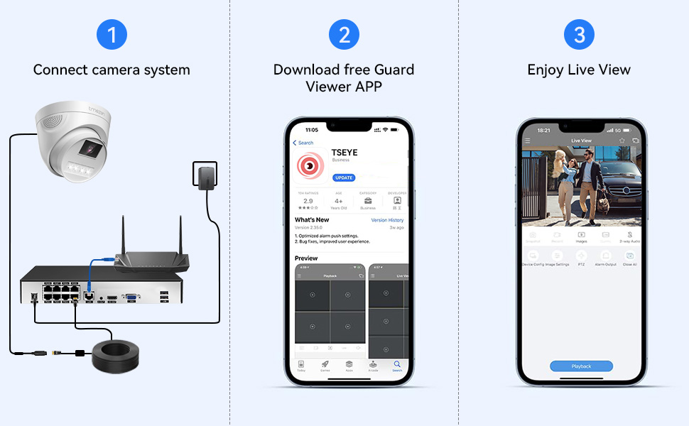Simple Remote Access & Live View Monitor your property from anywhere in the world with the free TSEYE app. View live feeds, playback recorded footage, receive motion alerts, and control camera settings directly from your iOS/Android smartphone or tablet.