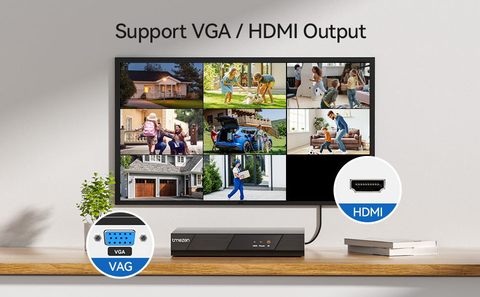 Dual Output for Local Monitoring Connect the NVR to your TV or monitor via HDMI or VGA for crystal-clear local viewing. Enjoy multi-screen live view, playback, and system management directly on a large display, perfect for home or office monitoring.