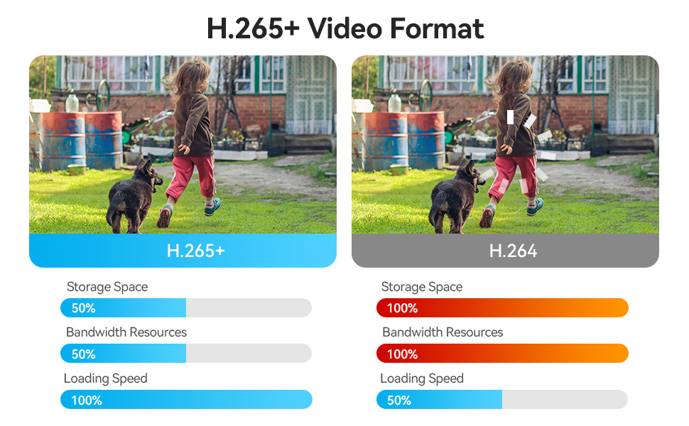 H.265+ Video Compression Save storage space and bandwidth with cutting-edge H.265+ encoding. It reduces file size by 50% compared to traditional H.264, while maintaining 4K video quality, so you can store more footage and stream smoothly even on slow networks.