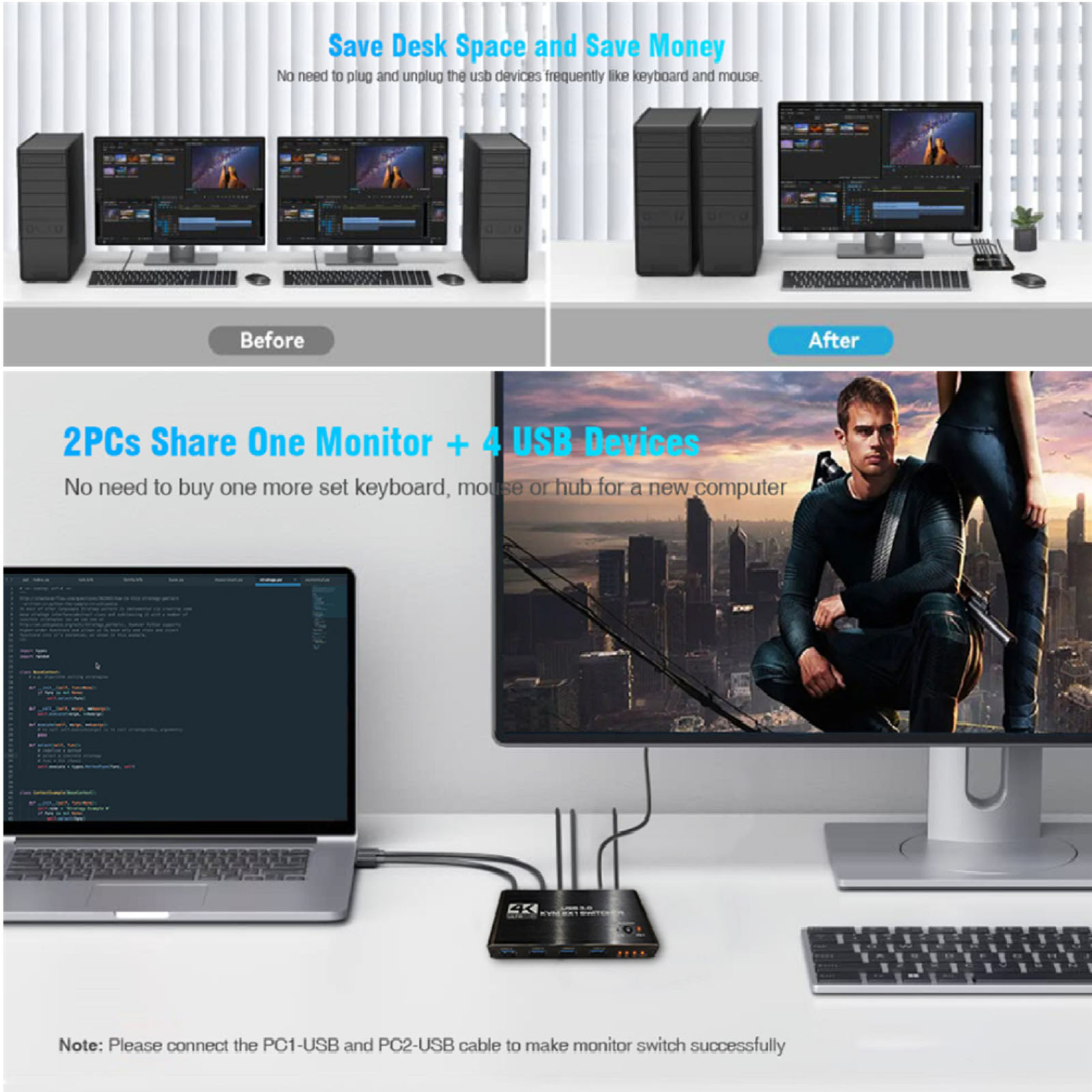 2. USB KVM Switch HDMI: USB and HDMI KVM switch allow a one-click swap between 2 computers to share 4 USB 3.0 peripherals and 1 HD monitor without constantly changing cables or setting up complex shareware. Make your work and life easier and more efficient!