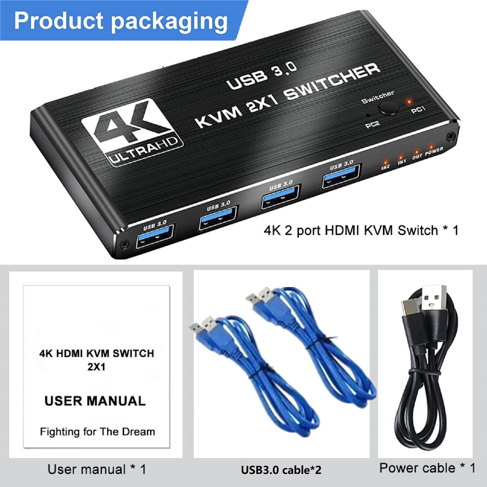 - Product Type: HDMI USBx4 KVM Switch (2 in 1 out)