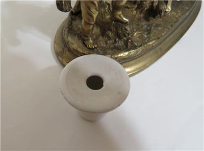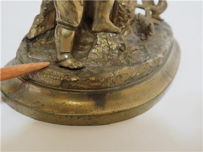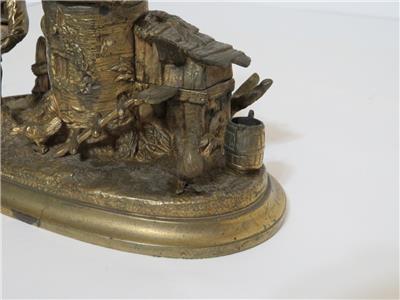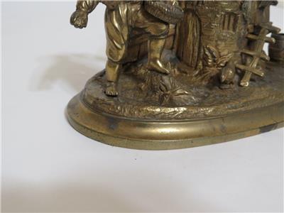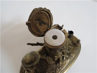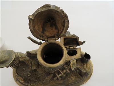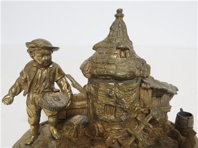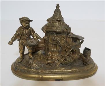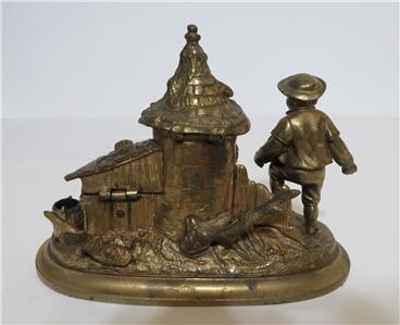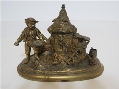 DESCRIPTION: .... Greetings! Thanks for stopping in, up for sale for your Consideration: ~~ Antique Cast Brass Inkwell Ink Stand Chicken Farmer 7" Long Figural Sculpture ~~