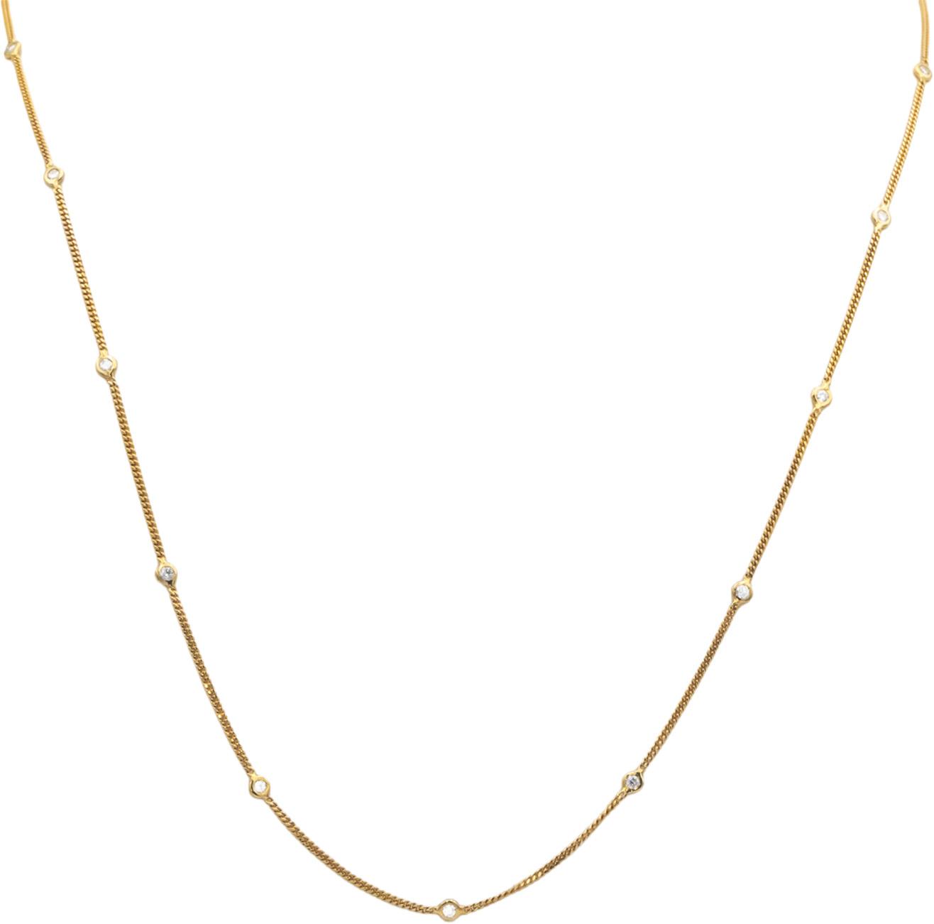 The necklace's minimalist form is enhanced by the evenly spaced diamonds, creating a harmonious and elegant look. Ideal for those who appreciate understated luxury.