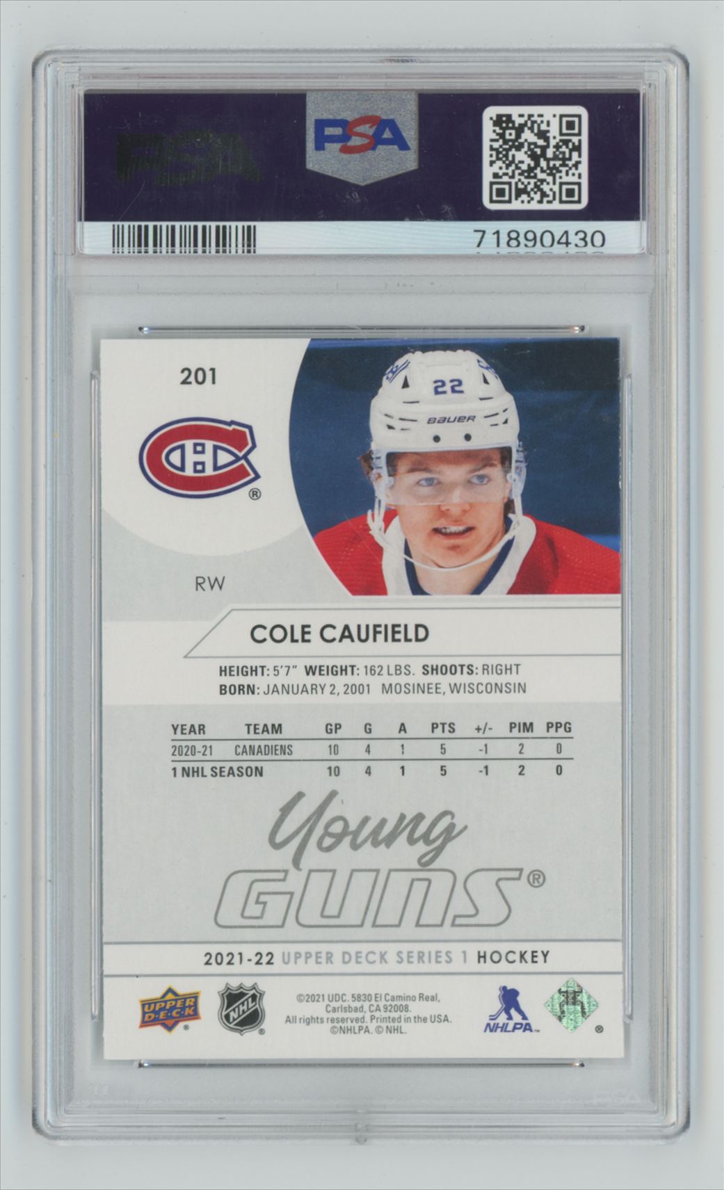 2021-22 Upper Deck Young Guns PSA 9 Cole Caufield Rookie #201 Montreal Canadiens