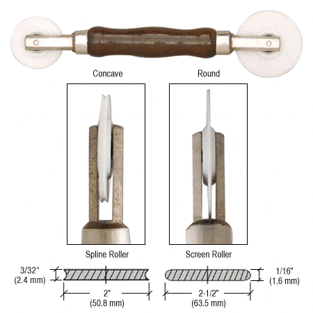 Get maximum efficiency with one of the most popular and widely used tools in the industry. The CRL Heavy-Duty Combination Nylon Wheel Screen and Spline Roller has on either end of the tool one round edge and one concave nylon roller with steel ball bearings. The contoured, hardwood handle allows for a comfortable grip, which helps alleviate fatigue. Replacement wheels are available when the originals are worn.
