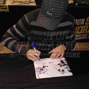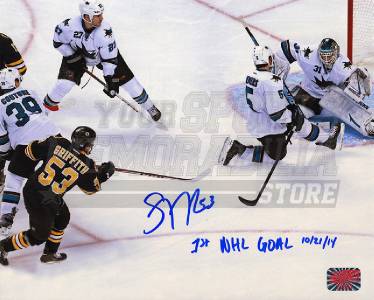 Boston Bruins Seth Griffith has hand signed in blue on this 8x10 inscribed 1st NHL goal home action vs San Jose Sharks photo during a private signing with Your Sports Memorabilia Store on November 2, 2014. YSMS is proud to be exclusive memorabilia distributor for: Boston Bruins Brad Marchand, Patrice Bergeron, Zdeno Chara, David Krejci, Rich Peverley, Tuukka Rask, Johnny Boychuk, Gregory Campbell, Dennis Seidenberg, Chris Kelly, Andrew Ference, Anton Khudobin, Torey Krug, Adam McQuaid, Loui Eriksson, Reilly Smith, Kevan Miller, Carl Soderberg, Matt Fraser and Seth Griffith. Chris Kreider, Cam Talbot, Dan Boyle and Ryan Haggerty of the New York Rangers YSMS watermark on item darkens it a bit, actual autograph item clearer. This item comes with a Your Sports Memorabilia hologram and Certificate of Authenticity with our unconditional lifetime guarantee.