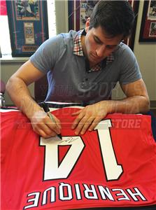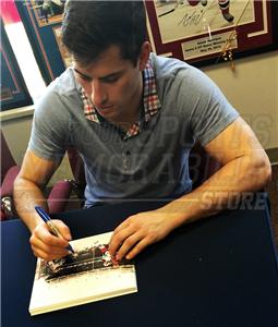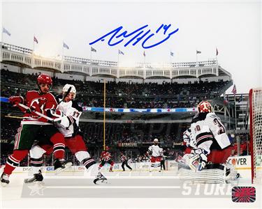 New Jersey Devils Adam Henrique has hand signed in blue on this 8x10 2014 Stadium Series at Yankee Stadium vs New York Rangers photo during a private signing for Your Sports Memorabilia Store on April 2, 2015.