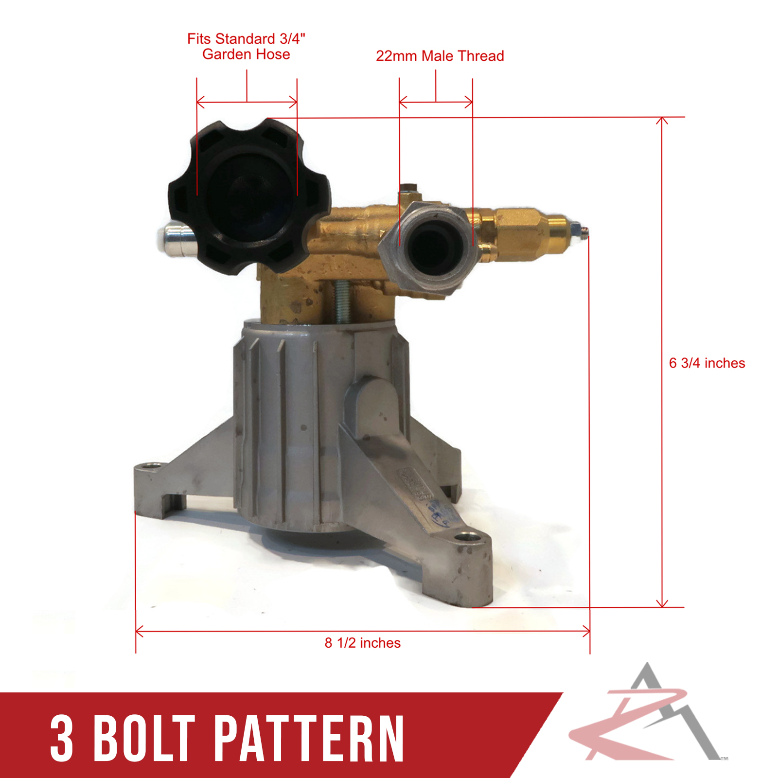 • Specs - Max Pressure: 2800 PSI. Max Flow: 2.5 GPM. Max Pump Speed: 3400 RPM. Shaft Size: 7/8". 3 Bolt Pattern: 7 11/16" x 6 3/16" x 6 7/16" & 4" from center to center of each outer hole. Max Temp: 140 F. Inlet Type: 3/4" GHA. Outlet Type: 22mm x 14mm. Oil Capacity: 2.2oz. Refer to images 2 & 3 for more information
