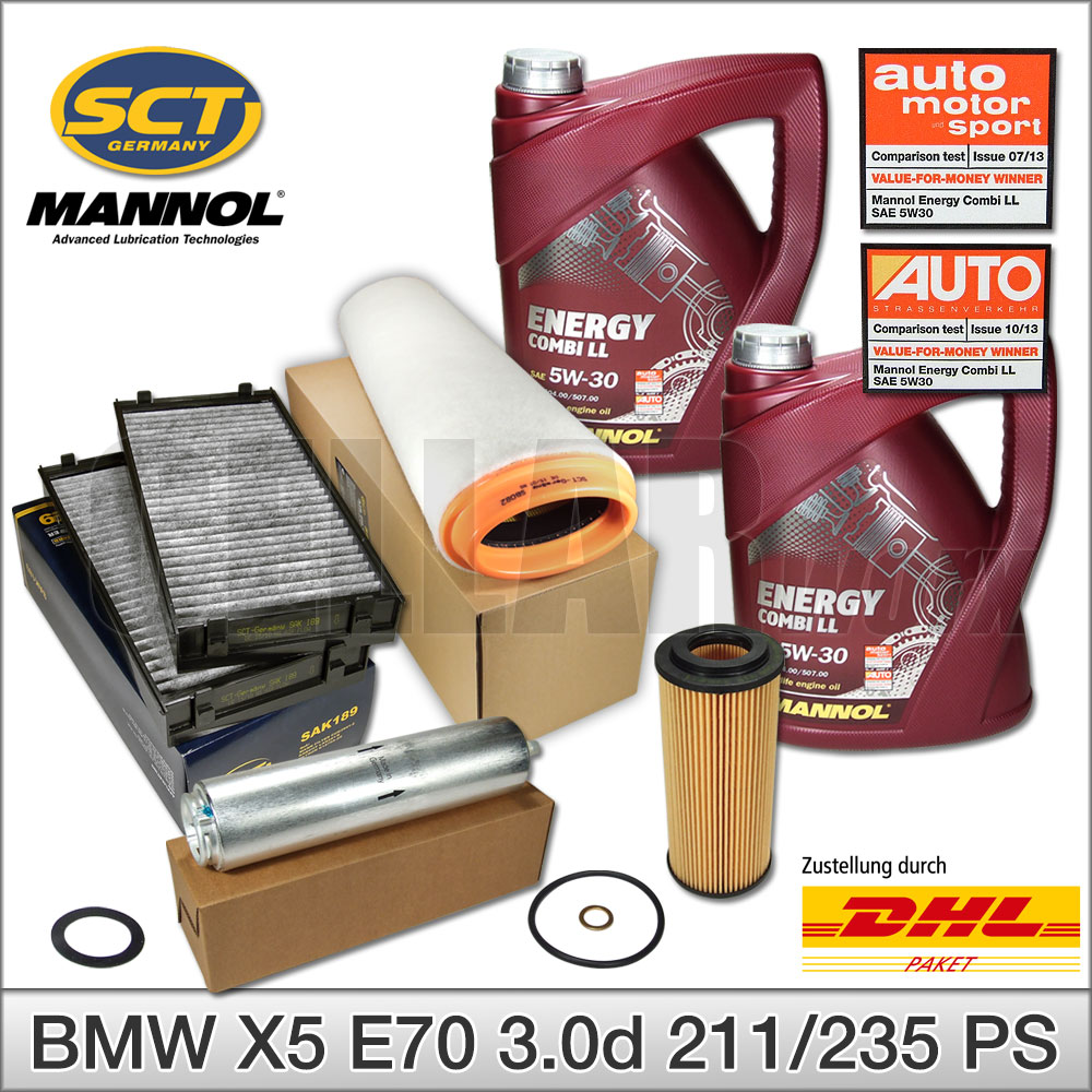 Inspektionskit für BMW X5 E70 3.0d Für Fahrzeuge mit 211 PS & 235 PS Lieferumfang: Innenraumfilterset mit Aktivkohle (SCT GERMANY) Motor-Luftfilter (SCT GERMANY) • tausendfach bewährter Filter aus dem Hause SCT Ölfilter (Markenfilter nach Bestand) • Ölfilter Dieselfilter / Kraftstofffilter (hochwertiger Markenfilter "Made in Germany") • garantiert 100% kompatibel und passgenau 10 Liter MANNOL Energy Combi LL 5W-30 API SN/CF Motoröl Entspricht folgenden Freigaben / Spezifikationen / Produkten: SAE 5W-30 API SN/CF ACEA C3 BMW Longlife-04 MB 229.51 PORSCHE C30 VW 504.00/507.00/502.00/505.00/503.01/506.00/ VW 505.01*/506.01** MANNOL Energy Combi LL ist ein synthetisches Motoröl für moderne Benzin- und Turbodiesel-Motoren mit Pumpe-Düse. Es bietet eine hohe Pumpfähigkeit bei Kaltstarts. Verfügt über eine optimale Viskosität bei einem weiten Temperaturbereich. Effektiver Schutz vor Verschleiß und bietet eine außergewöhnliche Sauberkeit der Motorteile. Geeignet für Motoren mit oder ohne verlängertem Ölwechselintervall (Long Life). *Ausgenommen VW-PDU-Motoren ohne LongLife-Service (WIV) **Ausgenommen V10-PDU-Motoren im Phaeton bis Februar 2006 sowie R5-PDU-Motoren im Touareg bis Dezember 2006 Altölverordnung: Gemäß der Altölverordnung sind wir verpflichtet, folgende gebrauchte Öle kostenlos zurückzunehmen: -- Vebrennungsmotorenöle -- Getriebeöle -- Ölfilter und beim Ölwechsel regelmäßig anfallende ölhaltige Abfälle. Sie können das Altöl in der Menge bei uns zurückgeben, welche der bei uns gekauften Menge entspricht. Unsere Annahmestelle ist: CELLARworx Cornelia Frings Werderstr. 40 42655 Solingen Öffnungszeiten: Mo. - Fr. 10 - 17 Uhr Sie können die Öle dort jederzeit während der Öffnungszeiten abgeben. Alternativ können Sie das gebrauchte Öl auch an unsere Annahmestelle senden, wobei die Versandkosten hierbei von Ihnen zu tragen sind. Bitte beachten Sie, dass für Altöl besondere Transportbedingungen gelten können. Unsere Annahmestelle verfügt über einen Servicepartner, der es ermöglicht, den Ölwechsel fachgerecht durchzuführen. Falls Sie ein gewerblicher Endverbraucher sind, weisen wir darauf hin, dass wir uns Ihnen gegenüber zur Erfüllung unserer Annahmepflichten Dritter bedienen können.