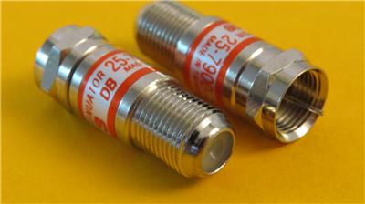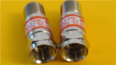 Standard inline F Connector Female-Male Nickel Plate Accuracy within 5% Return Loss -20 db 22 guage center pin DC to 1000 MHz Bandwith