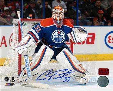 Edmonton Oilers Cam Talbot has hand signed in blue on this 16x20 goaltending photo during a private signing with Your Sports Memorabilia Store on October 7, 2015.