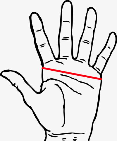 Measure your hand with a tape measure around the knuckles of your hand(indicated by the red line in the illustration below).